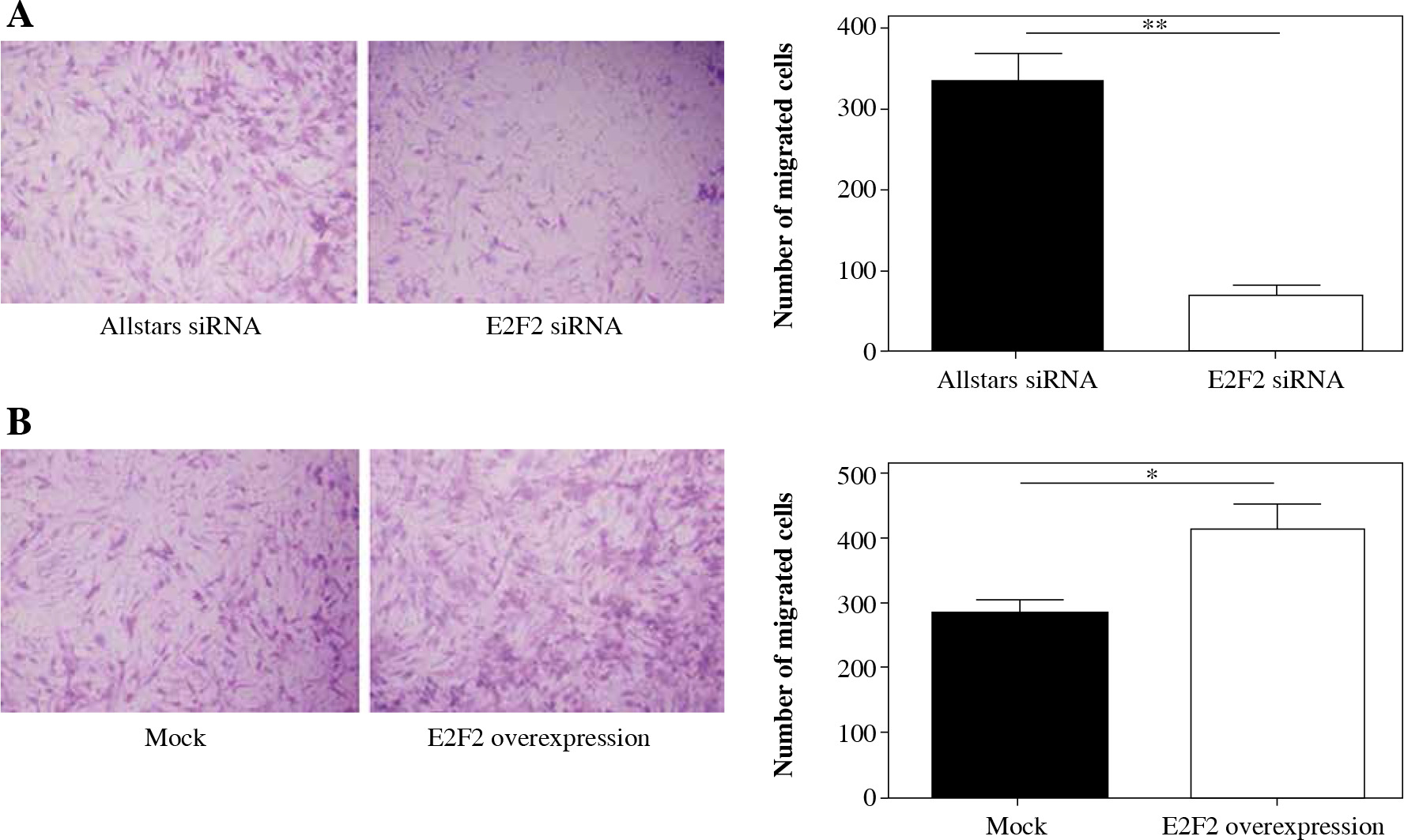 The effect of E2F2 expression on migration ability of RASF using transwell assays. A) The cell migration of RASF with transfection of anti-E2F2 siRNA or Allstars siRNA was measured, and the result is depicted in one map. B) The cell migration of RASF with transfection of the E2F2-expressing plasmids or the blank plasmids (mock) was measured, and the result is depicted in one map. *p < 0.05, **p < 0.01