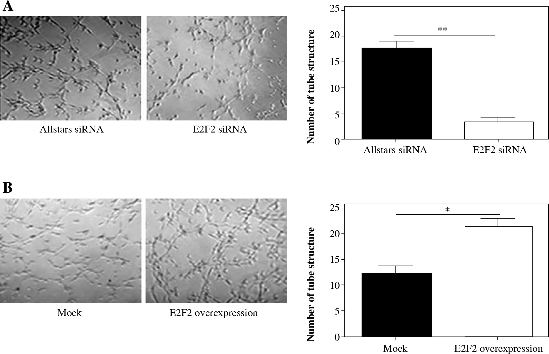 The effect of E2F2 expression on tube-like structure formation ability in RASF using Matrigel culture assay. A) Tube-like structure formation of RASF with transfection of anti-E2F2 siRNA or Allstars siRNA was measured, and the result is depicted in one map. B) Tube-like structure formation of RASF with transfection of the E2F2-expressing plasmids or the blank plasmids (mock) was measured, and the result is depicted in one map. *p < 0.05, **p < 0.01