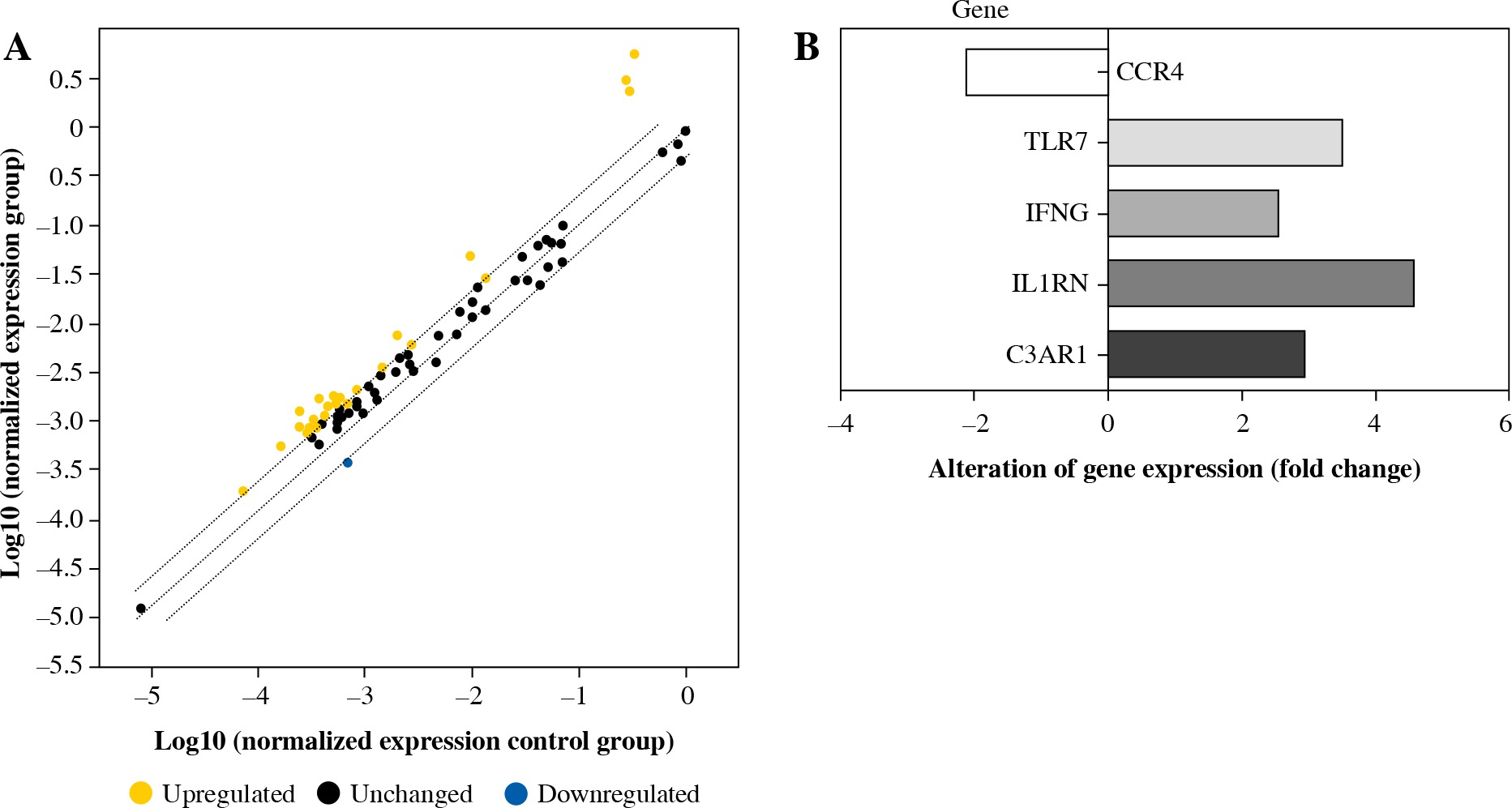 PCR array was used to examine the expression of 84 immunity and inflammation-related genes. Five genes had more than a twofold change in expression between E2F2-inhibited RASF and RASF controls transfected with Allstars siRNA. The expression of complement component 3a receptor 1 (C3AR1), interleukin 1 receptor antagonist (IL1RN), interferon γ (IFN-γ) and Toll-like receptor 7 (TLR7) was significantly up-regulated, and the expression of C-C chemokine receptor type (CCR4) was significantly down-regulated in RASF with inhibited E2F2 expression. The results are shown in Figure 2.