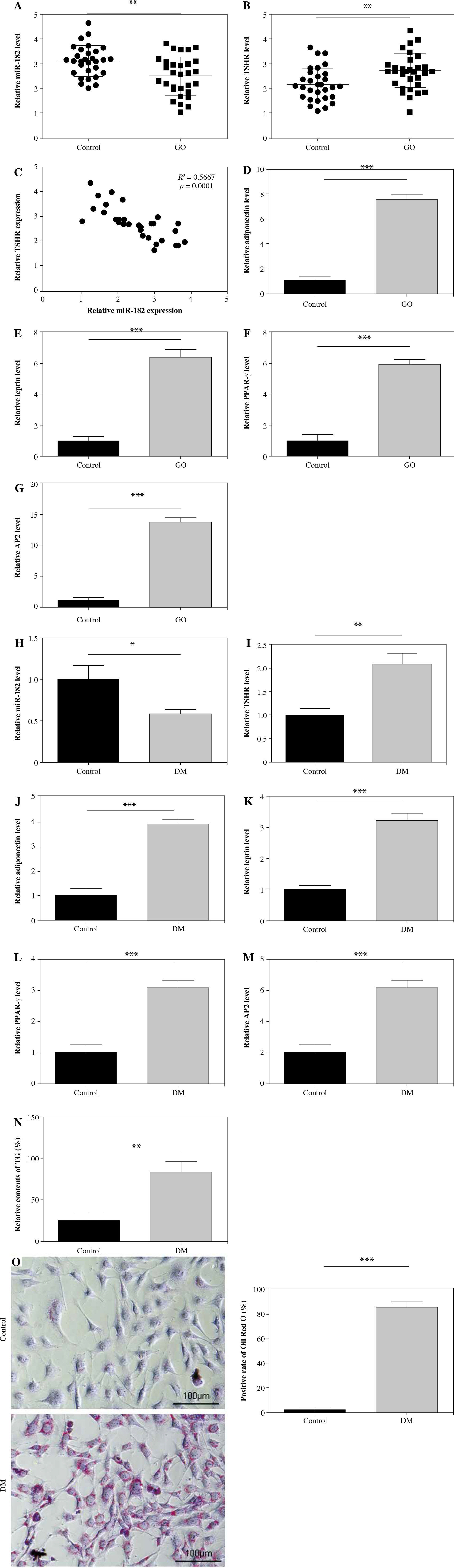 Expression of miR-182 and TSHR in GO patients and 3T3-L1 adipocytes. A, B) Expression of miR-182 and TSHR in preorbital adipose tissue was determined by qPCR assay. C) Pearson’s correlation coefficient was determined to evaluate the correlation between miR-182 and TSHR. D-G) Adipocytokine expression in preorbital adipose tissue was determined by qPCR assay. The descriptive statistics were presented as mean ± SD. *p < 0.05, **p < 0.01, ***p < 0.001 Expression of miR-182 and TSHR in GO patients and 3T3-L1 adipocytes. H-M) The expression of miR-182, TSHR and adipocytokines in DM-induced 3T3-L1 cells was determined by qPCR assay. N) ELISA assay was manipulated to detect TG content. The descriptive statistics were presented as mean ± SD. *p < 0.05, **p < 0.01, ***p < 0.001 O) Lipid droplet content was ascertained by Oil Red O staining. For each group at least three independent experiments were performed. The descriptive statistics were presented as mean ± SD. *p < 0.05, **p < 0.01, ***p < 0.001