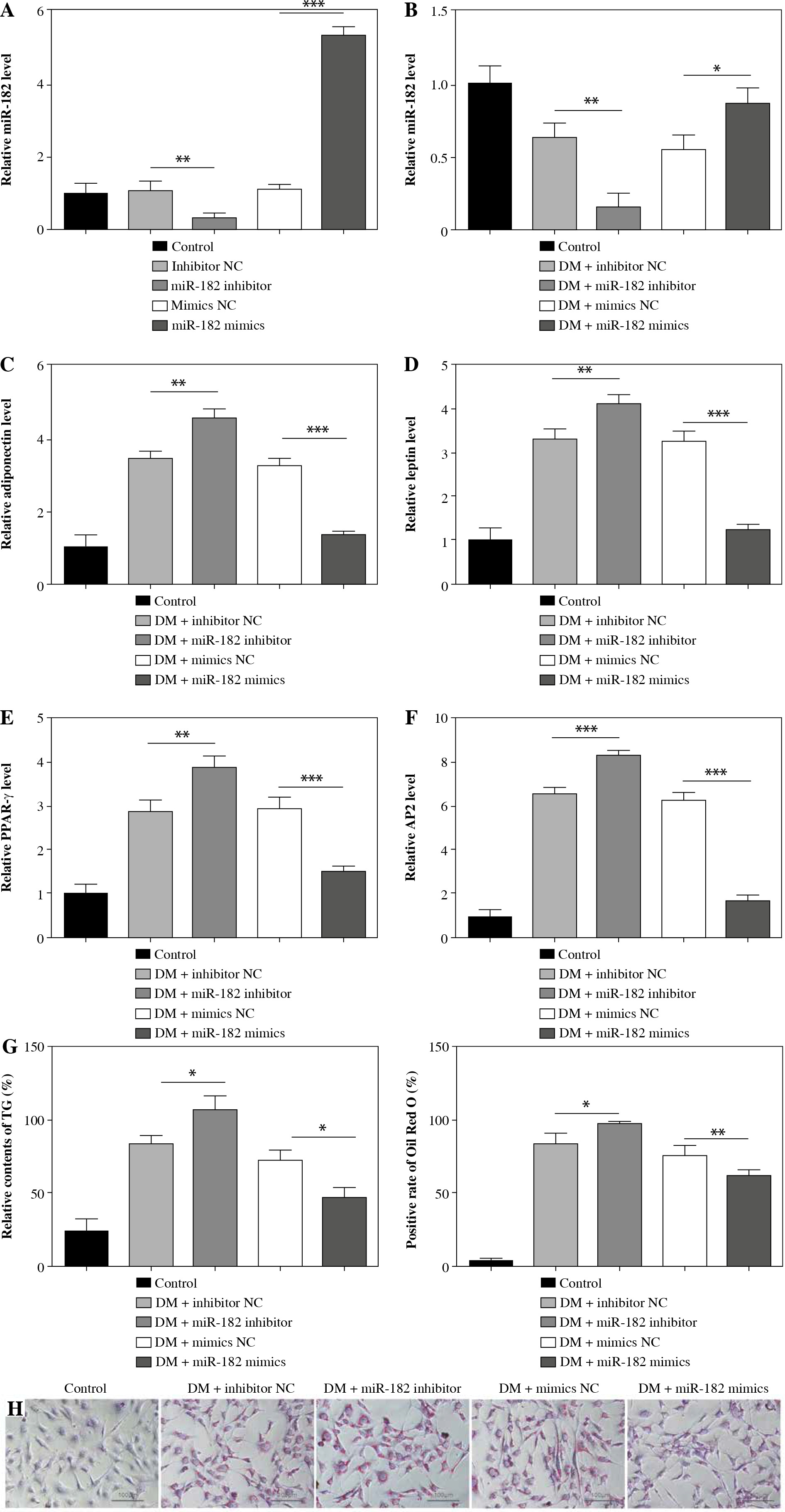 In order to explore the effect of miR-182 on adipogenic differentiation, we transfected miR-182 inhibitor or miR-182 mimics into DM-induced 3T3-L1 cells. As shown in Figure 2A, miR-182 expression was significantly inhibited by miR-182 inhibitor, whereas miR-182 mimics promoted miR-182 expression. MiR-182 expression in DM-induced 3T3-L1 cells was decreased (Fig. 2B). MiR-182 inhibitor further downregulated miR-182 expression, whilst miR-182 mimics could upregulate miR-182 expression in DM-induced 3T3-L1 cells (Fig. 2B). Then, we found that the expression levels of adiponectin, leptin, PPAR-γ and AP2 in DM-induced 3T3-L1 cells were significantly increased, and miR-182 inhibitor further aggravated this trend; by contrast, miR-182 mimic transfection reduced the levels of adipocytokines (Fig. 2C-F). The TG content in DM-induced 3T3-L1 cells increased significantly and miR-182 inhibitor enhanced TG release, but miR-182 mimics decreased TG release (Fig. 2G). Also, in the Oil Red O staining assay, miR-182 inhibitor promoted the increase of lipid droplets in DM-induced 3T3-L1 cells, while miR-182 mimics had the opposite effect, which reduced lipid droplet production (Fig. 2H). The above results indicated that miR-182 mimics reduced the adipogenic differentiation of DM-induced 3T3-L1 cells.