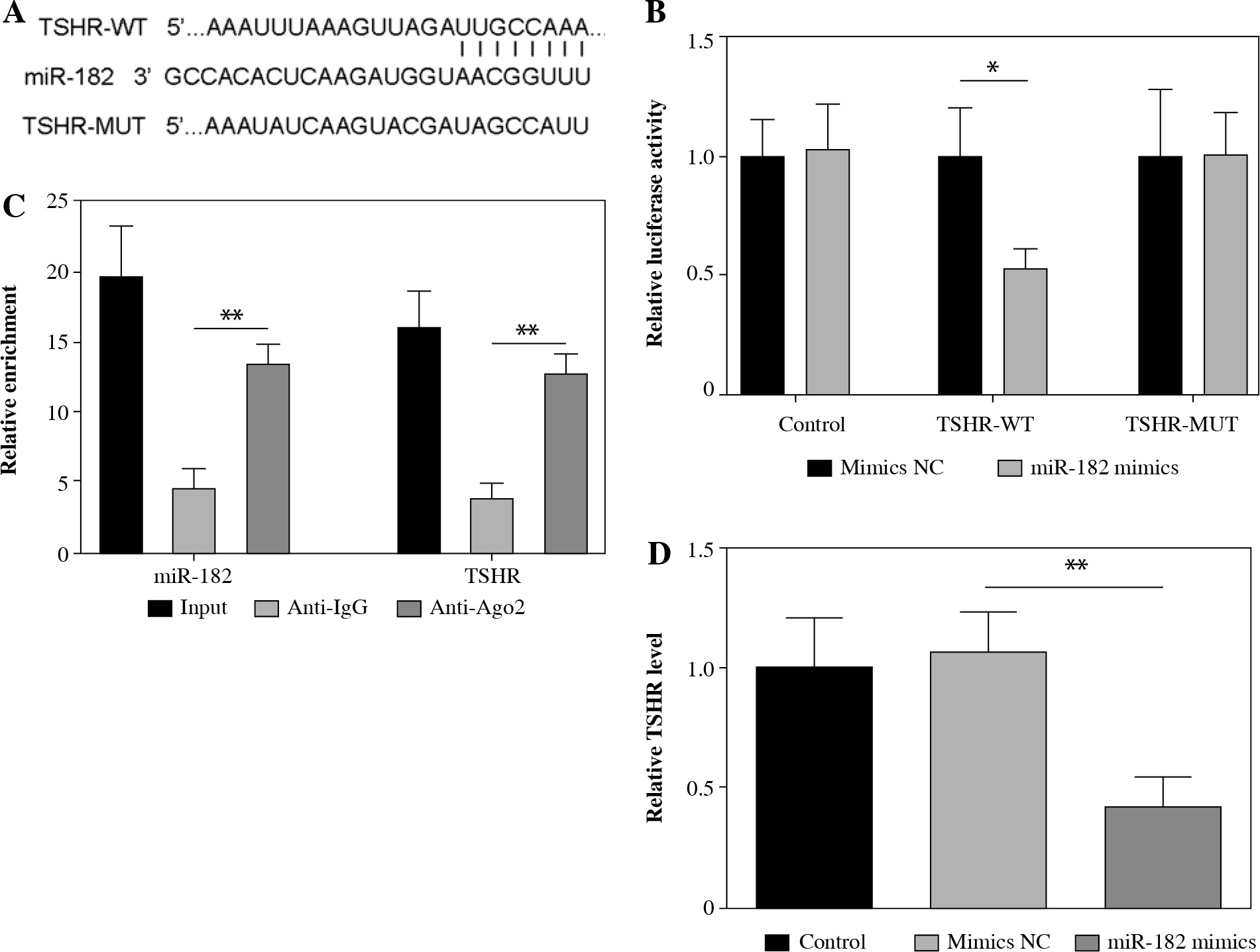 MiR-182 directly targeted TSHR. A) TargetScan was used to predict the relationship of miR-182 and TSHR. B, C) Dual-luciferase reporter genes and RIP were used to confirm the targeting relationship. D) TSHR expression was ascertained by qPCR assay. For each group at least three independent experiments were performed. The descriptive statistics were presented as mean ±SD. *p < 0.05, **p < 0.01, ***p < 0.001