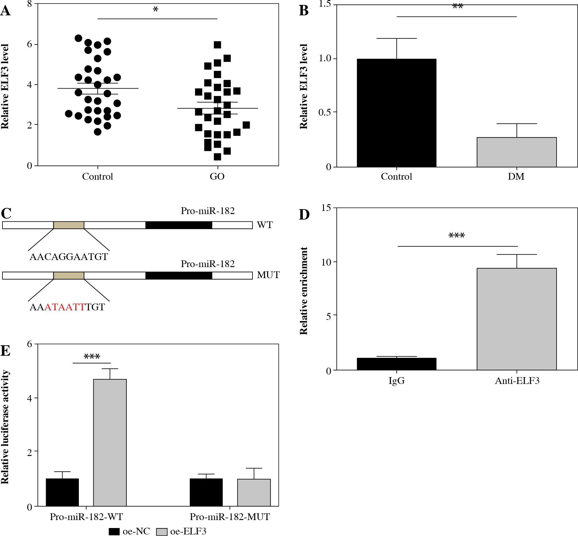 ELF3 expression was significantly down-regulated in GO patients and DM-induced 3T3-L1 cells (Fig. 5A, B). To determine the targeting relationship between miR-182 and ELF3, we predicted that ELF3 bound to multiple promoters of miR-182 using the JASPAR database (Fig. 5C). ChIP assay and dual-luciferase reporter assay revealed a targeted binding relationship between miR-182 and ELF3 (Fig. 5D, E). The above results suggested that ELF3 bound to the promoter of miR-182 and increased its expression.