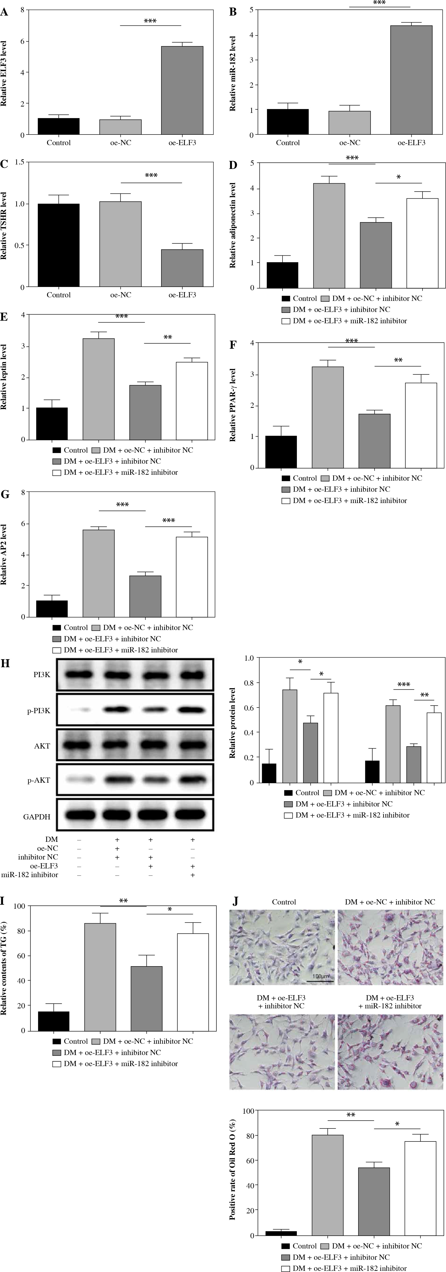 MiR-182 inhibitor reversed the inhibitory effect of oe-ELF3 on adipogenic differentiation. A-G) The expression of ELF3, miR-182, TSHR and adipocytokines was determined by qPCR assay. The descriptive statistics were presented as mean ± SD. *p < 0.05, **p < 0.01, ***p < 0.001 H) PI3K/AKT signaling pathway in DM-induced 3T3-L1 cells was ascertained by WB. I) ELISA assay was manipulated to detect TG content. J) Lipid droplet content was ascertained by Oil Red O staining. For each group at least three independent experiments were performed. The descriptive statistics were presented as mean ± SD. *p < 0.05, **p < 0.01, ***p < 0.001