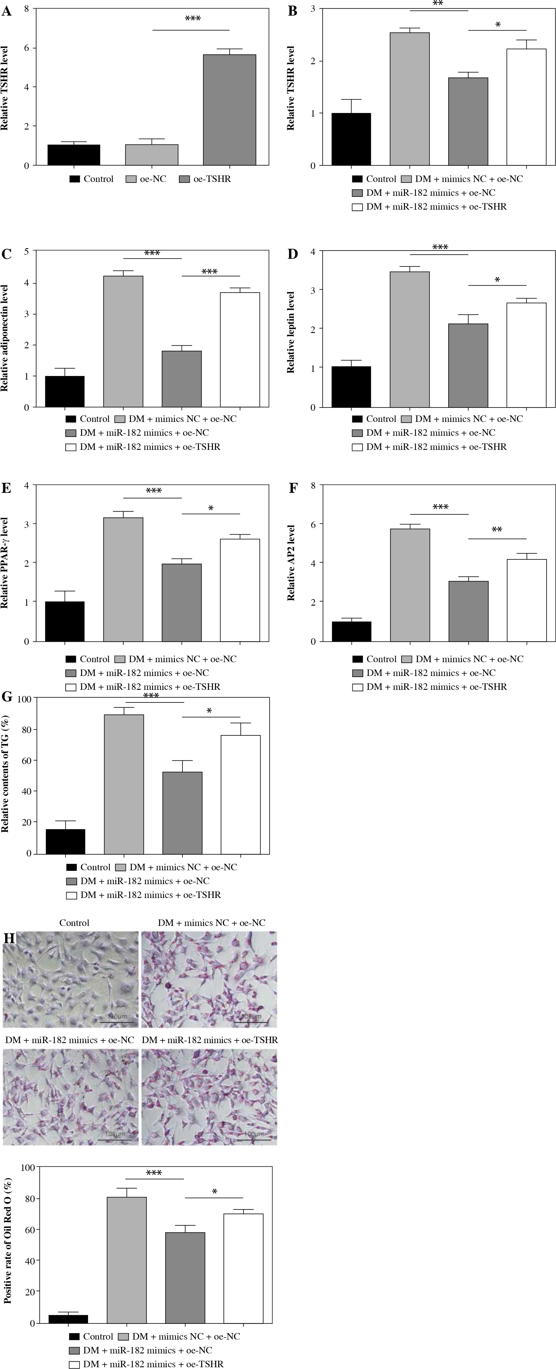Oe-TSHR reversed the function of miR-182 in adipogenic differentiation. A-F) The expression of TSHR and adipocytokines was determined by qPCR assay. The descriptive statistics were presented as mean ± SD. *p < 0.05, **p < 0.01, ***p < 0.001 G) ELISA assay was manipulated to detect TG content. H) Lipid droplets content was ascertained by Oil Red O staining. For each group at least three independent experiments were performed. The descriptive statistics were presented as mean ± SD. *p < 0.05, **p < 0.01, ***p < 0.001