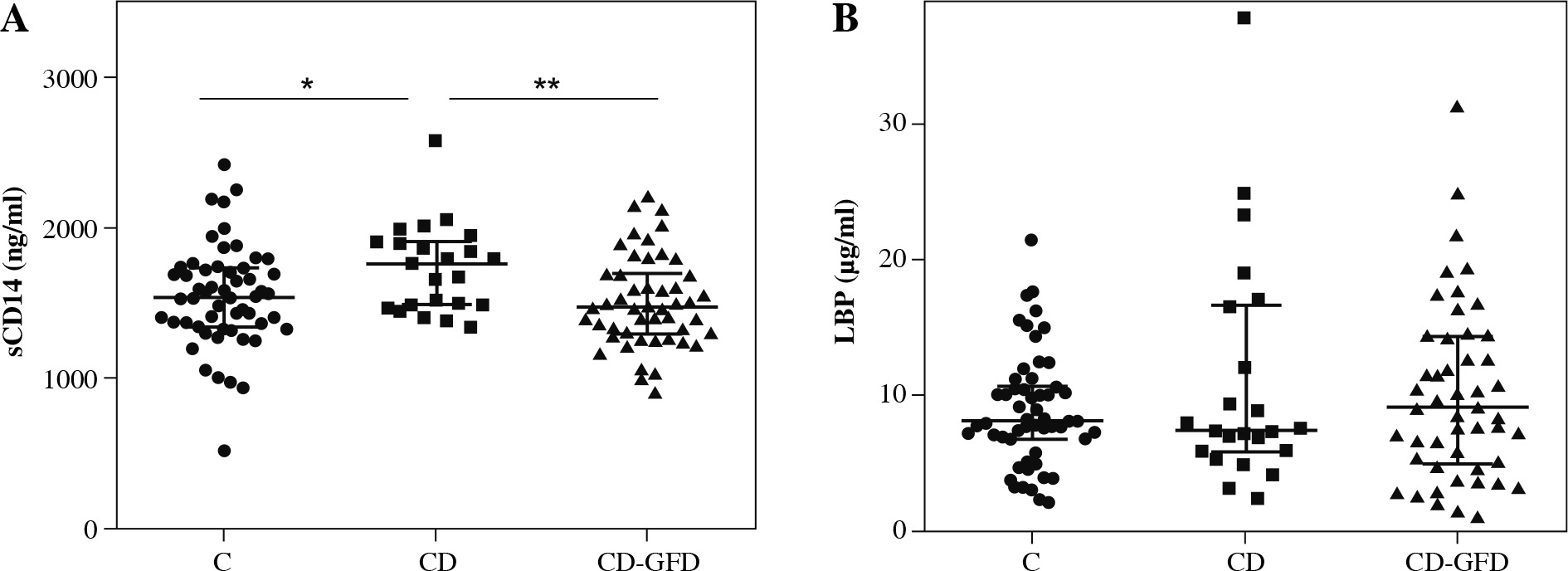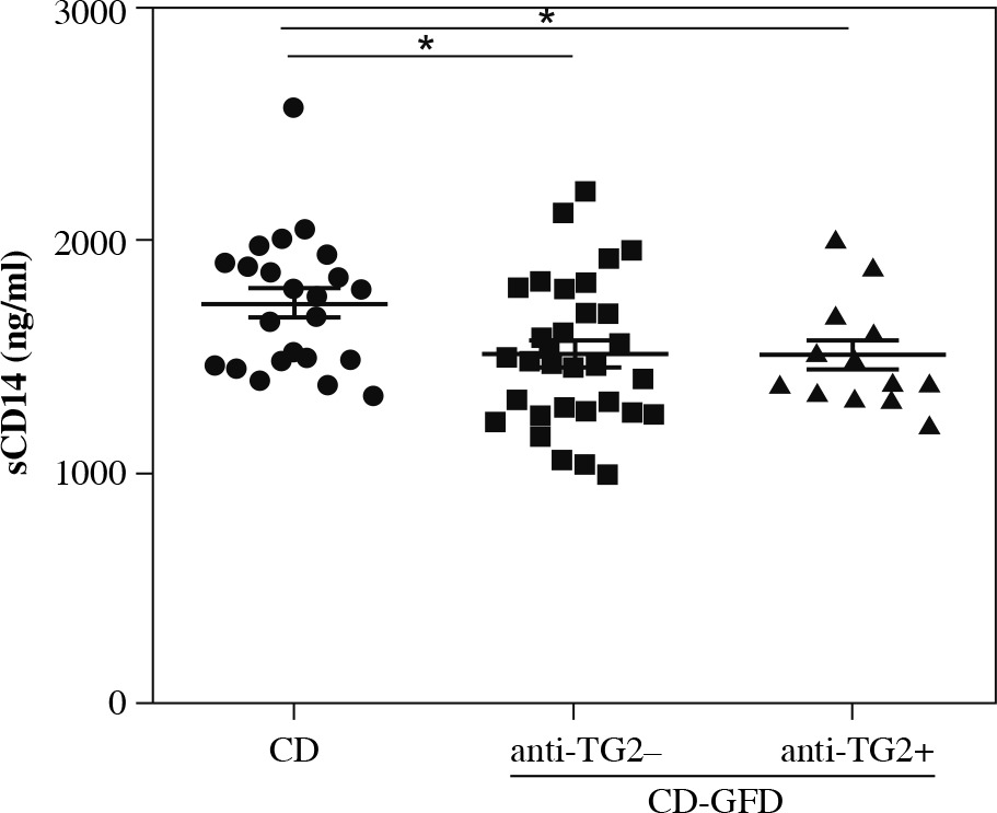 Reports on sCD14 levels in CD are limited. Hoffmanová et al. reported increased levels of sCD14 in CD patients compared to patients on a GFD and a control group [15]. However, Uhde et al. did not find statistically significant differences in sCD14 levels between CD patients and controls; this study did not include patients on a GFD [16]. Our results agree with the first observation, since we detected a statistically significant increase of sCD14 levels in CD patients compared to a control group and with patients on a GFD.