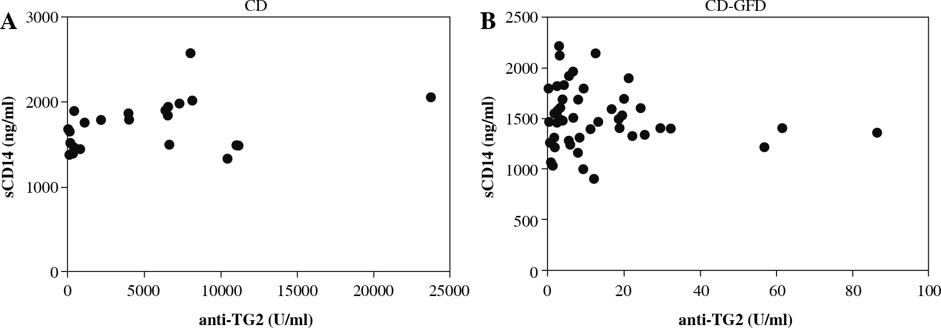 In Figure 3 the results of the correlation between serum levels of sCD14 and IgA anti-TG2 antibody are shown. No significant correlation was observed between sCD14 and the autoantibody from untreated CD patients and CD-GFD patients.