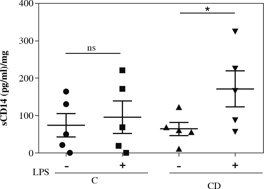 In this study, the production of sCD14 by both untreated CD and normal intestinal tissue was analyzed. We found that LPS induces the production of sCD14 by biopsies from CD patients, in contrast to uninflamed intestinal tissue from controls. These results indicate a role of LPS in the intestinal production of sCD14 in CD patients.