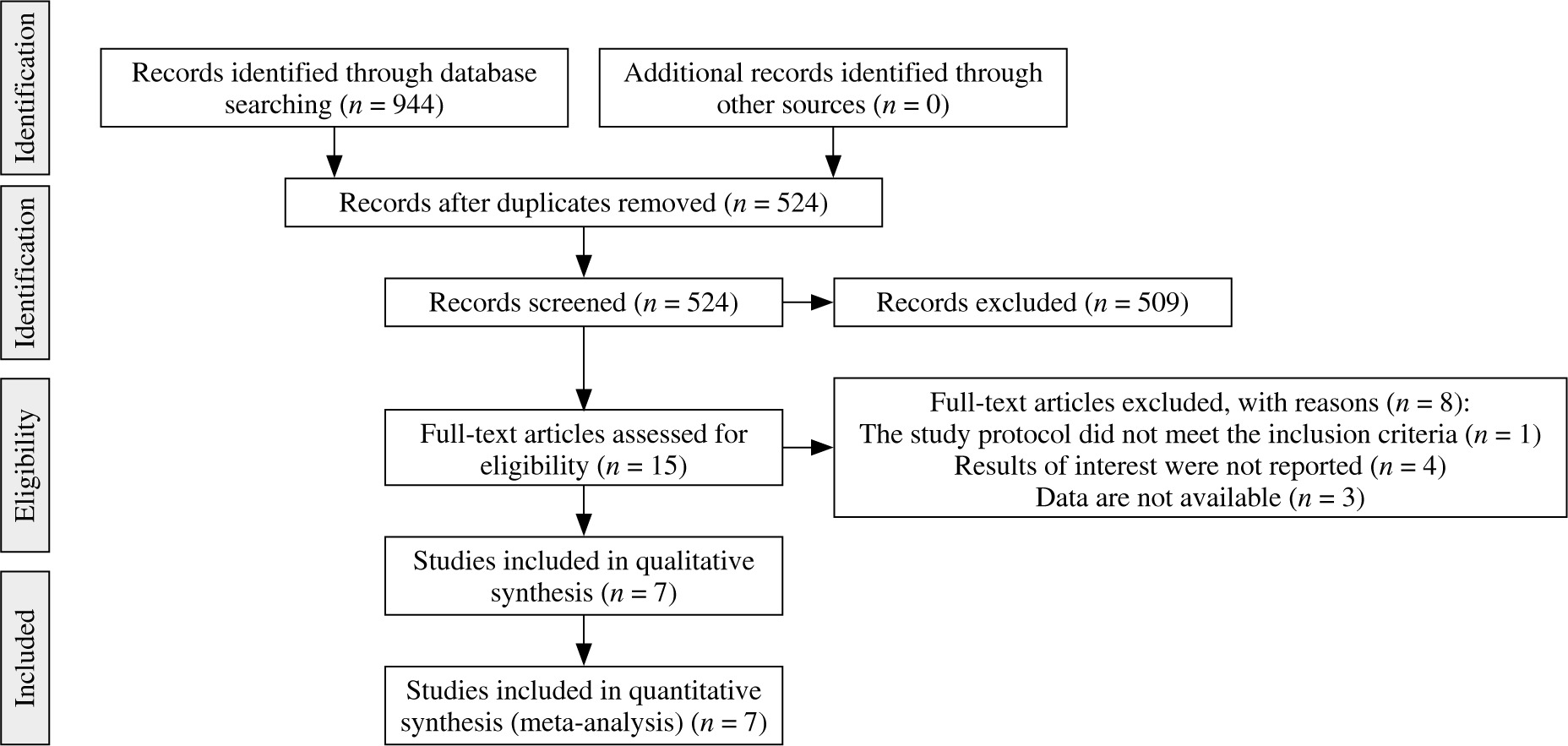 Based on our literature search, a total of 944 studies were identified. After excluding duplicates, 524 studies remained, 15 of which were considered potentially relevant and were read in full text. Among the 15 studies, 1 was excluded because the study protocol did not meet the inclusion criteria, 4 were excluded because no outcomes of interest were reported and 3 were excluded because the dates were unavailable. Finally, 7 studies containing 3,990 patients were included in the meta-analysis. The flowchart for the search procedure is displayed in Figure 1.