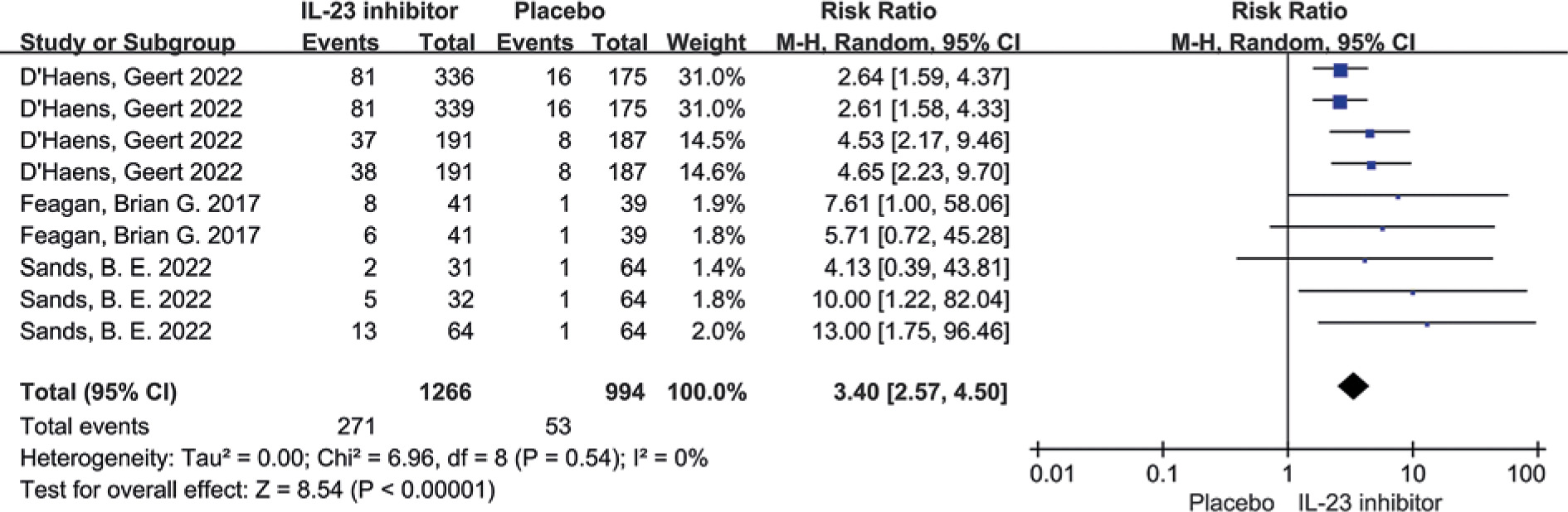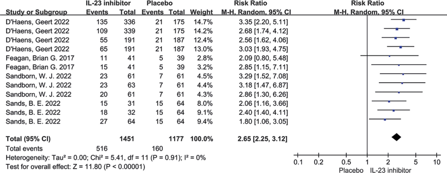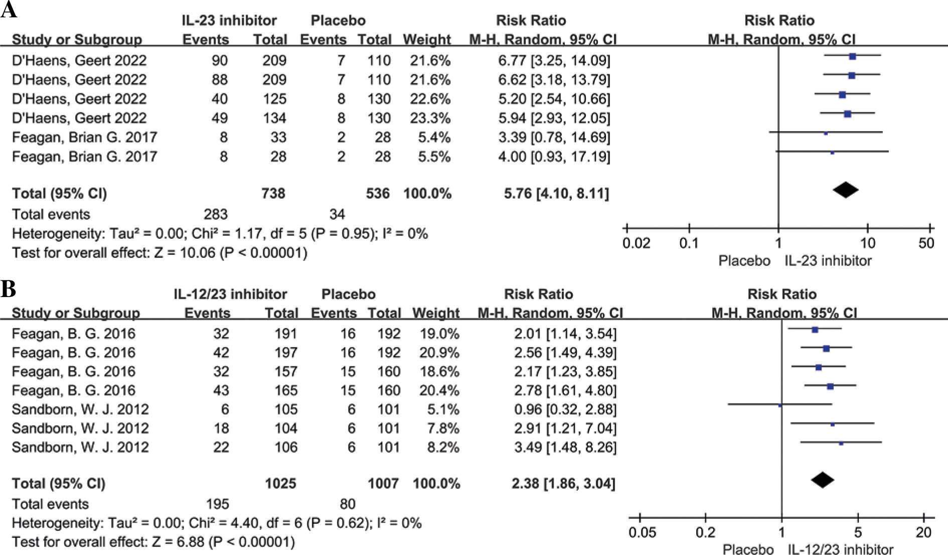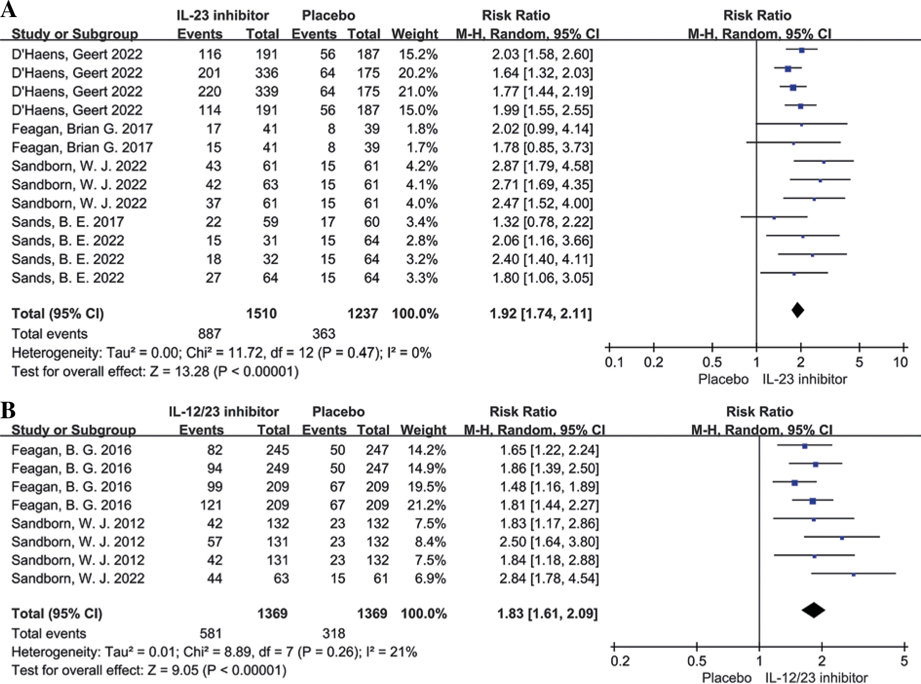 The IL--23 pathway has been implicated in the pathogenesis of several immune-mediated chronic inflammatory diseases including psoriasis and CD [11, 12]. Also, biologics such as IL-23 inhibitors and IL-12/23 inhibitors have been shown to be effective in the treatment of patients with CD in randomized controlled trials (RCTs), both in the induction period and maintenance period. With the continuous emergence of the IL-23 inhibitors, there has not been a comprehensive analysis of the research in this area. In the present study, the efficacy of IL-23 and IL-12/23 inhibitors in the induction phase for the treatment of CD was further evaluated through a meta-analysis based on published randomized controlled trials.