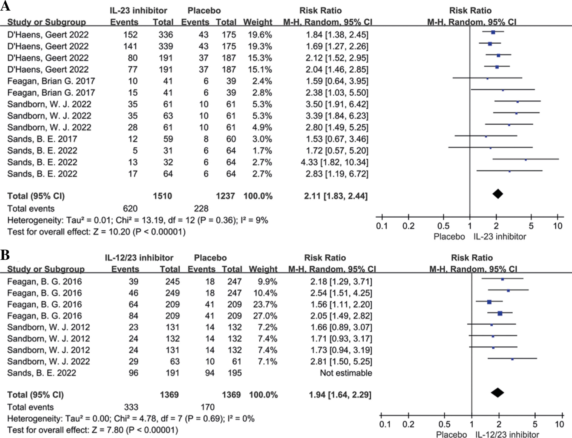 The IL--23 pathway has been implicated in the pathogenesis of several immune-mediated chronic inflammatory diseases including psoriasis and CD [11, 12]. Also, biologics such as IL-23 inhibitors and IL-12/23 inhibitors have been shown to be effective in the treatment of patients with CD in randomized controlled trials (RCTs), both in the induction period and maintenance period. With the continuous emergence of the IL-23 inhibitors, there has not been a comprehensive analysis of the research in this area. In the present study, the efficacy of IL-23 and IL-12/23 inhibitors in the induction phase for the treatment of CD was further evaluated through a meta-analysis based on published randomized controlled trials.