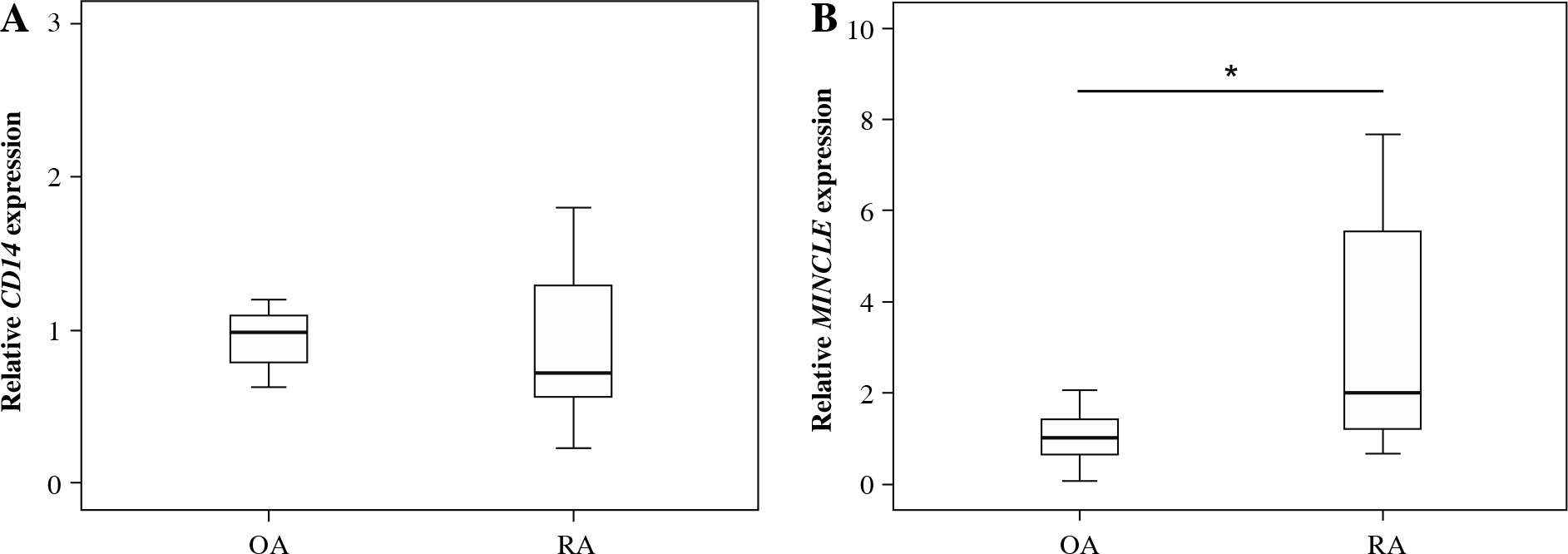 Here, we examined MINCLE expression in ST from RA and OA patients.