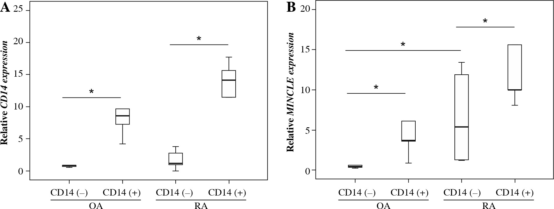 Our study has a number of limitations. First, we did not examine a healthy control group. Second, all samples were extracted from patients’ knees during joint replacement surgery; thus, the joints were severely damaged by the disease. Further investigation in patients with early disease is needed to reveal the importance of MINCLE in RA. Third, we did not examine the mechanism by which MINCLE contributes to RA pathology. Finally, we did not identify which cells within the CD14– fraction express MINCLE. Additional studies are needed to clarify these issues.