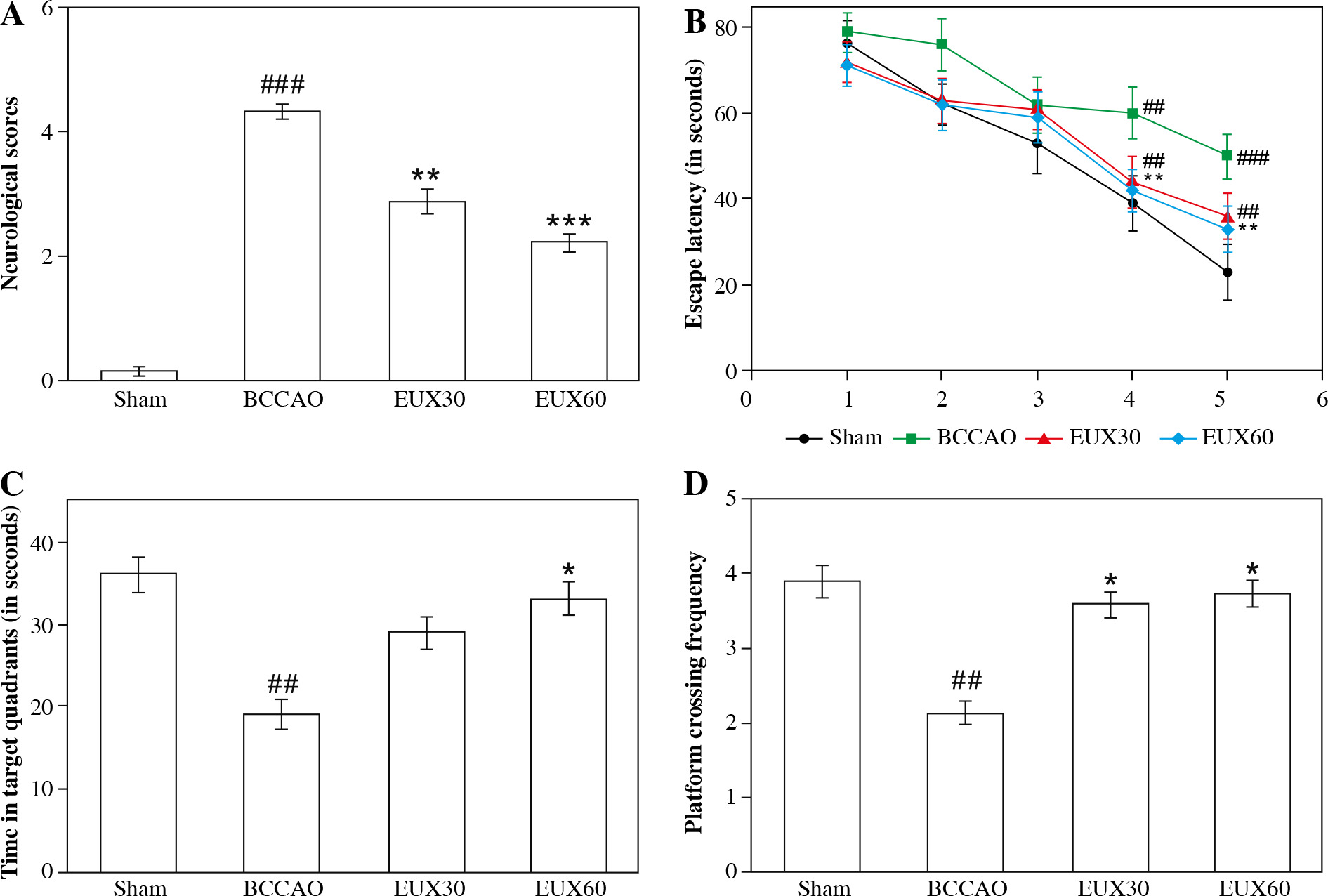 Effect of EUX pre-treatment on learning and remembrance capacities of BCCAO induced mice was evaluated by estimating the neurological grade and conducting a Morris water maze test. Values are expressed as means ± S.E.M. (n = 8). Compared to the Sham group: #p < 0.05, ##p < 0.01, ###p < 0.001. Compared to the BCCAO group: *p < 0.05, **p < 0.01, ***p < 0.001
