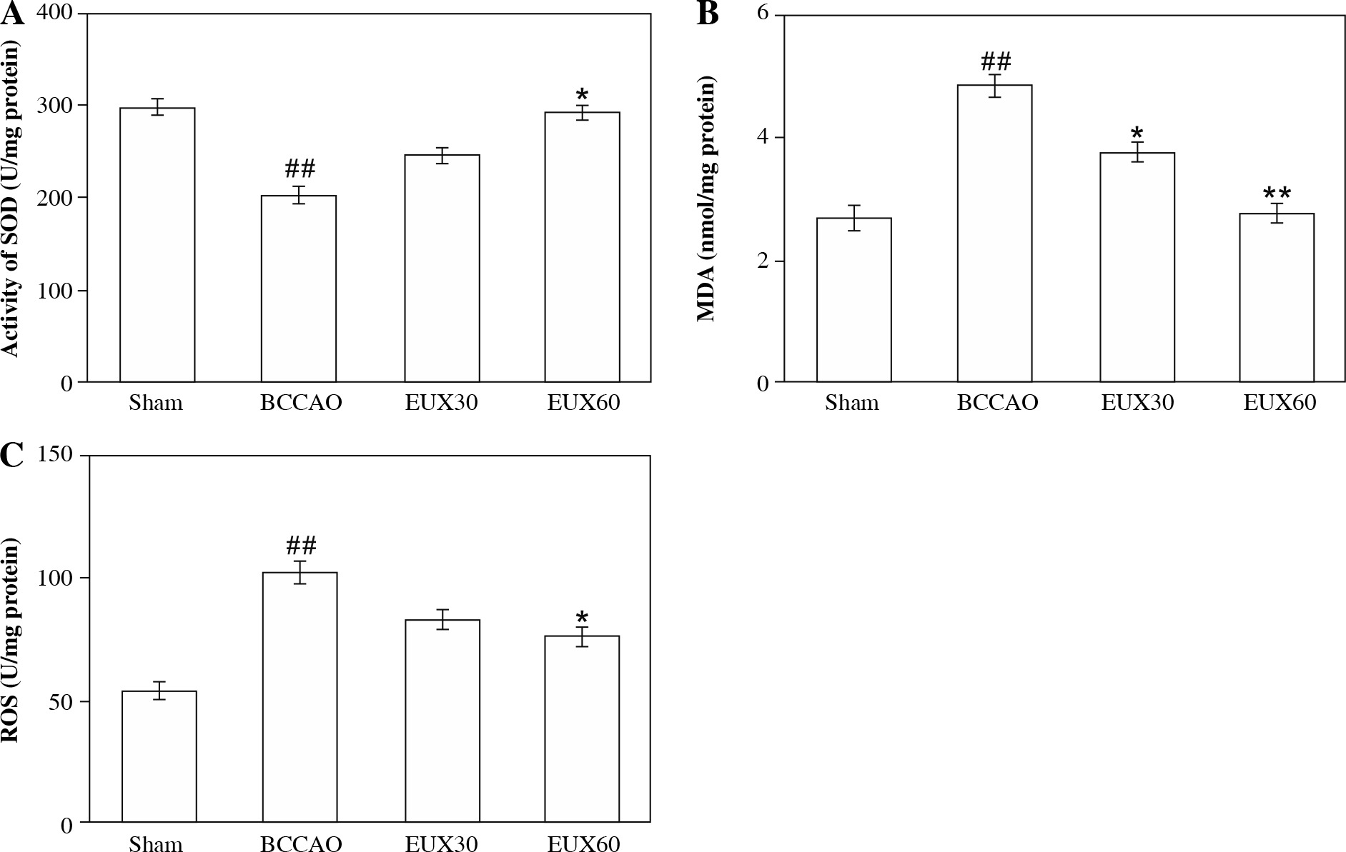 Effect of EUX pre-treatment on the levels of MDA, SOD and ROS was estimated to evaluate the extent of ox- idative stress in the hippocampal fractions. Data represent means ± S.E.M. (n = 8). Compared to the Sham group: #p < 0.05, ##p < 0.01, ###p < 0.001. Compared to the BCCAO group: *p < 0.05, **p < 0.01, ***p < 0.001