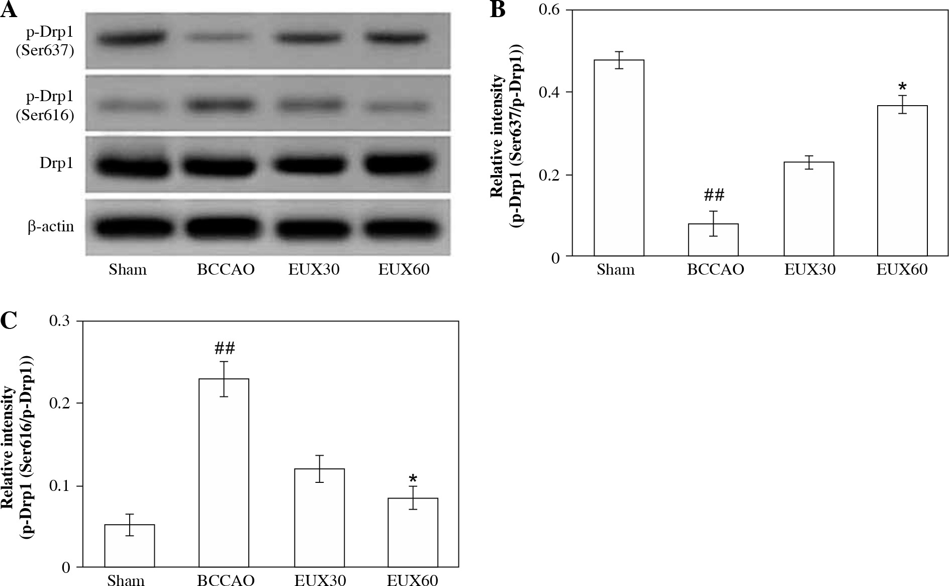EUX suppressed hippocampal mitochondrial frag- mentation in BCCAO treated mice. EUX treatment in cerebral ischemia induced mice significantly upregulated the expression of Drp1 (Ser637) and markedly downreg- ulated the Drp1 (Ser616) expression in the hippocampal specimens. Data represent means ± S.E.M. (n = 8). Com- pared to the Sham group: #p < 0.05, ##p < 0.01, ###p < 0.001. Compared to the BCCAO group: *p < 0.05, **p < 0.01, ***p < 0.001