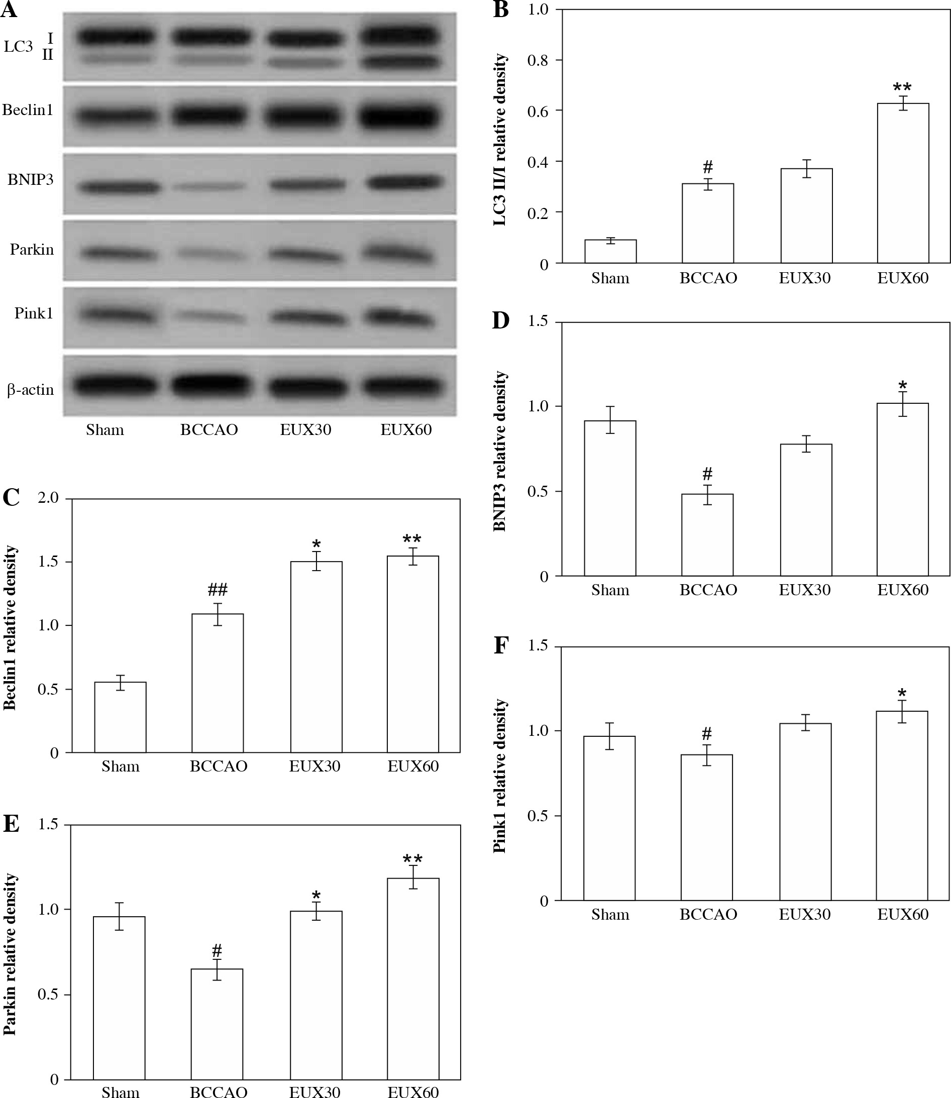 Effect of EUX pre-treatment on the mitophagy sig- naling pathway proteins (LC3 II/I, Beclin1, BNIP3, Parkin and Pink1) in the ischemic mice using Western blotting. Data represent means ± S.E.M. (n = 8). Compared to the Sham group: #p < 0.05, ##p < 0.01, ###p < 0.001. Compared to the BCCAO group: *p < 0.05, **p < 0.01, ***p < 0.001