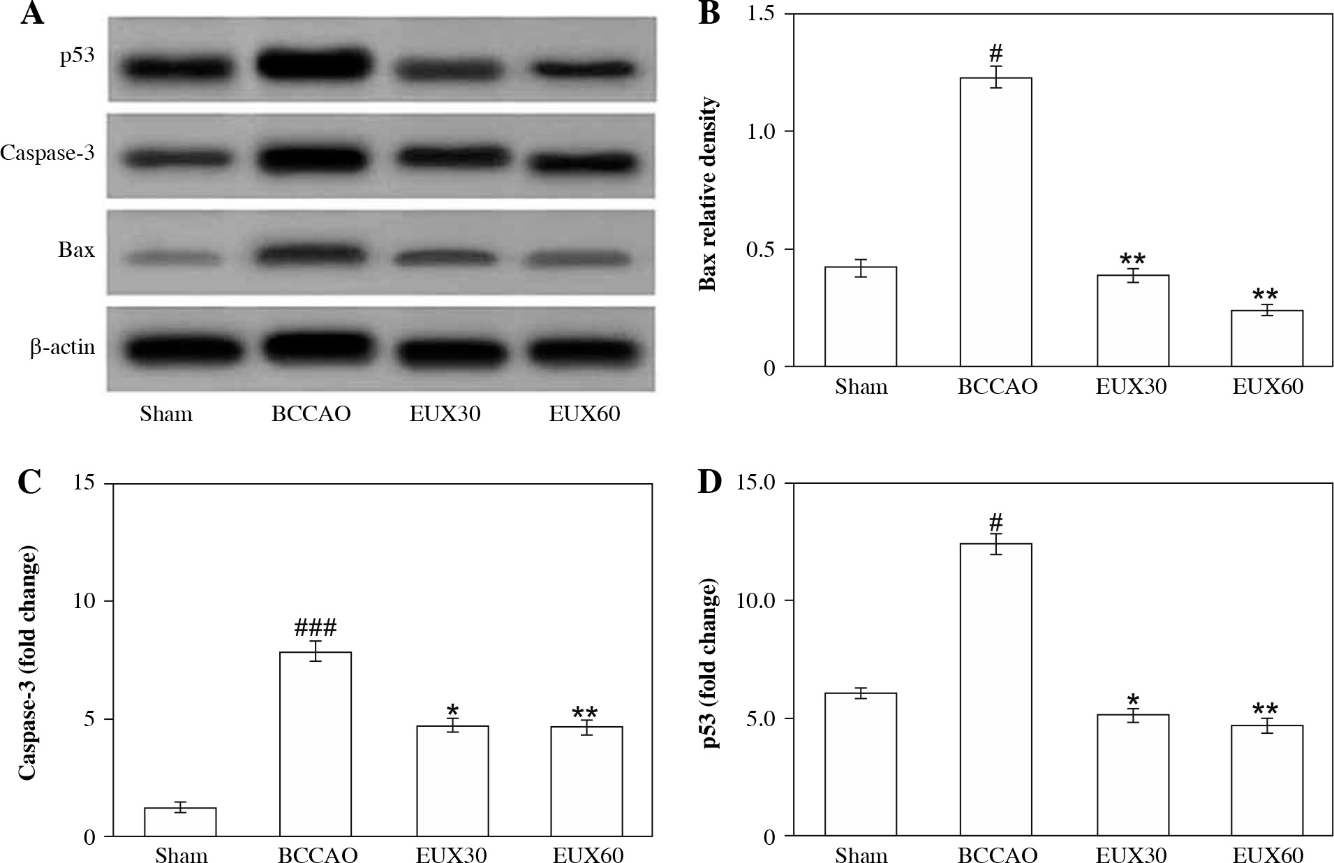 Previous investigations reveal that Bax triggers mitochondrial apoptosis mediated through inculcation of PGAM5 (phosphoglycerate mutase 5)-Drp1 complexes over the mitochondrial surface [25]. An elevation in the expression of caspase-3, a prominent marker protein in the apoptotic cascade, indicates the manifestation of the apoptotic process. Findings of our investigations revealed that P53, caspase 3 and Bax protein expression levels in hippocampal tissues of mice were significantly enhanced in the BCCAO mouse model, whereas the expression of such apoptotic-linked proteins was remarkably downregulated after EUX treatment.