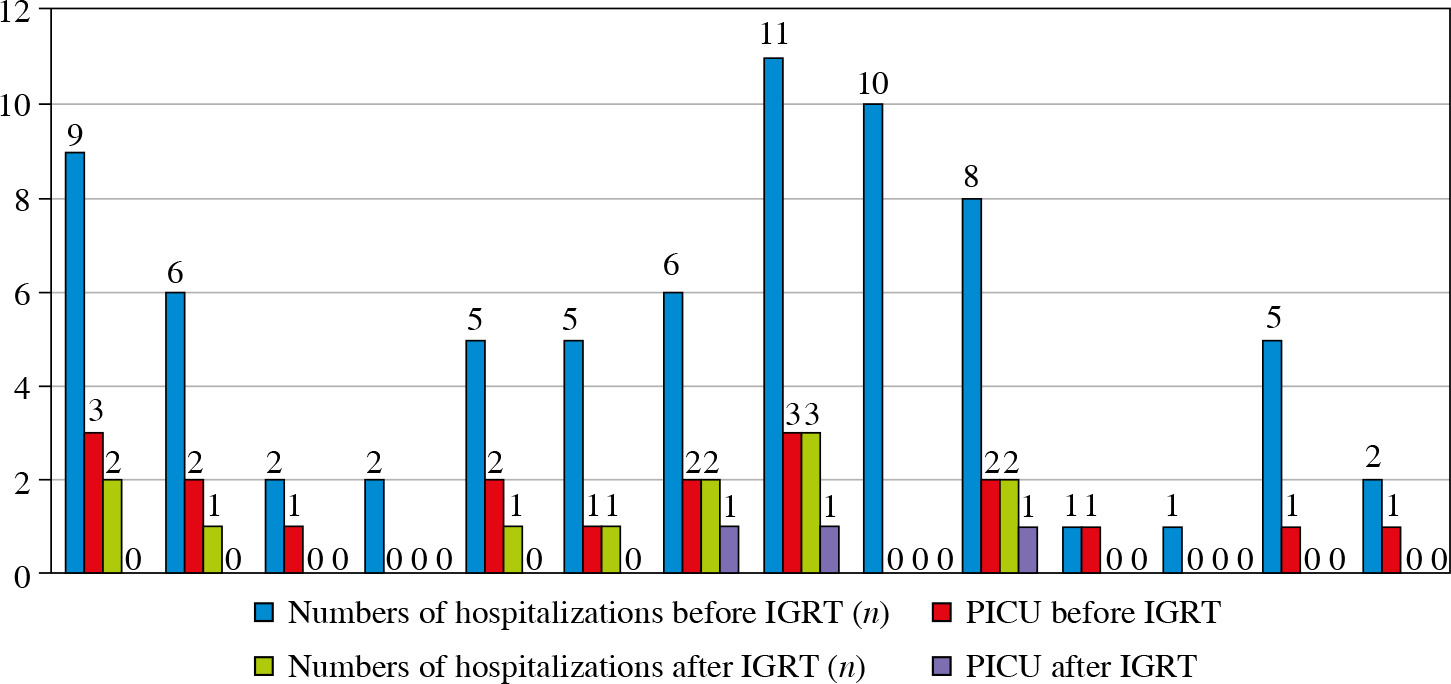 Overall, all patients with rare syndromes in this cohort had abnormalities in the following characteristics on admission: immunoglobulin levels, lymphocyte subsets, CD25 expression, and specific antibody responses. During the follow-up after IGRT, all T-cell abnormalities were improved, while B-cell abnormalities persisted; these findings suggested that our patients predominantly had antibody deficiencies associated with mild T-cell abnormalities caused by recurrent infections. After IGRT, there were significant reductions in the number of infection- related hospitalizations (from 5.21 ±3.35 [median, 5] to 0.86 ±1.03 [median, 1]) and the number of intensive care unit admissions (from 1.36 ±1.01 [median, 1] and 0.21 ±0.43 [median, 0]) (p < 0.001) (Fig. 2). The proportion of patients < 3 P for body weight and/or height also decreased, to 28.5% (n = 4). Of the three oxygen-dependent patients, oxygen dependency was improved in two; only one patient with tracheostoma remained oxygen-dependent. There was no cardiological condition leading to hospitalization and recurrent infections in our patients. One of them (P13) has dilated cardiomyopathy and another (P5) has hypertrophic cardiomyopathy, and neither patient has been hospitalized during IGRT. IGRT was discontinued in two patients (P7 and P13) who exhibited significant clinical improvement during follow-up.