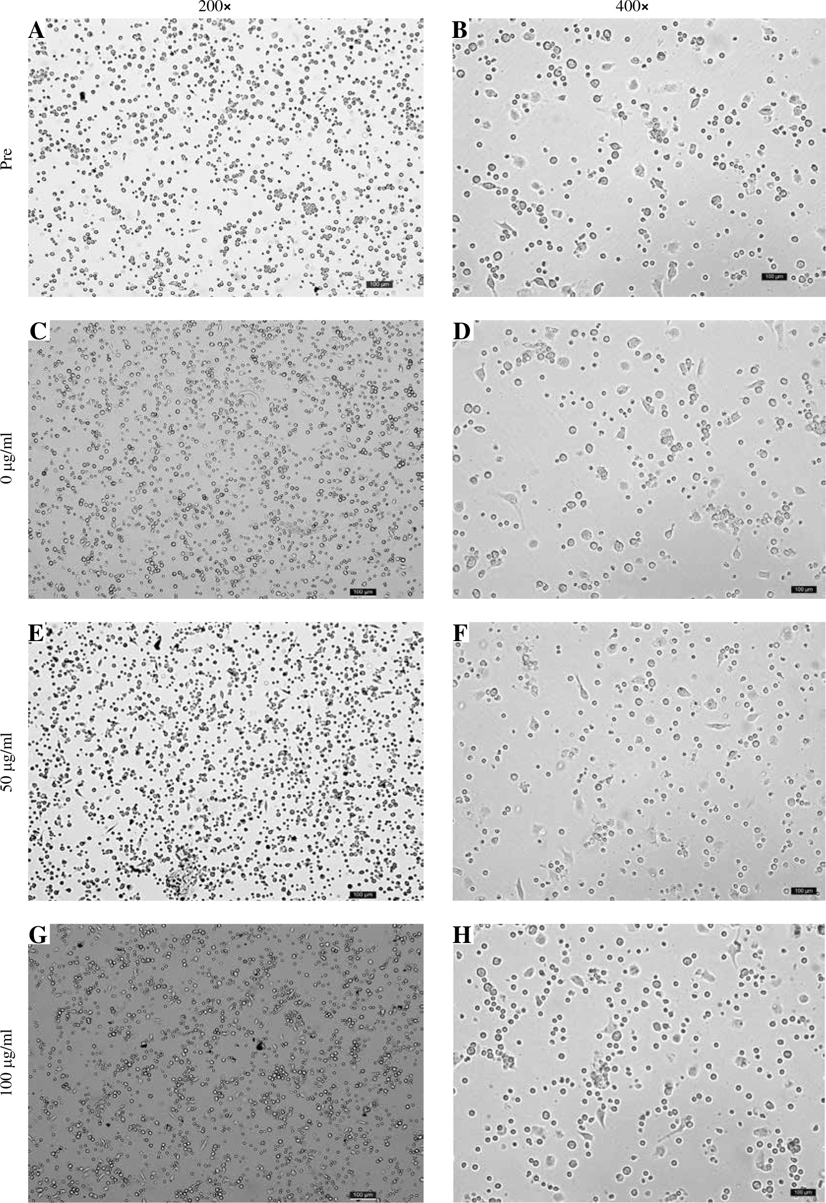 Mouse peritoneal macrophages before and after in vitro fine particulate matter (FPM) stimulation. Mouse peritoneal macrophages were isolated and cultured for 20 h, and then the macrophages were stimulated with different concentrations of FPM (0 μg/ml, 50 μg/ml, 100 μg/ml). Images of macrophages were taken after 6 hours of stimulation. Pre represents pre-treatment. 200× indicates a magnification of 200. 400× indicates a magnification of 400. The scale in the picture is 100 μM