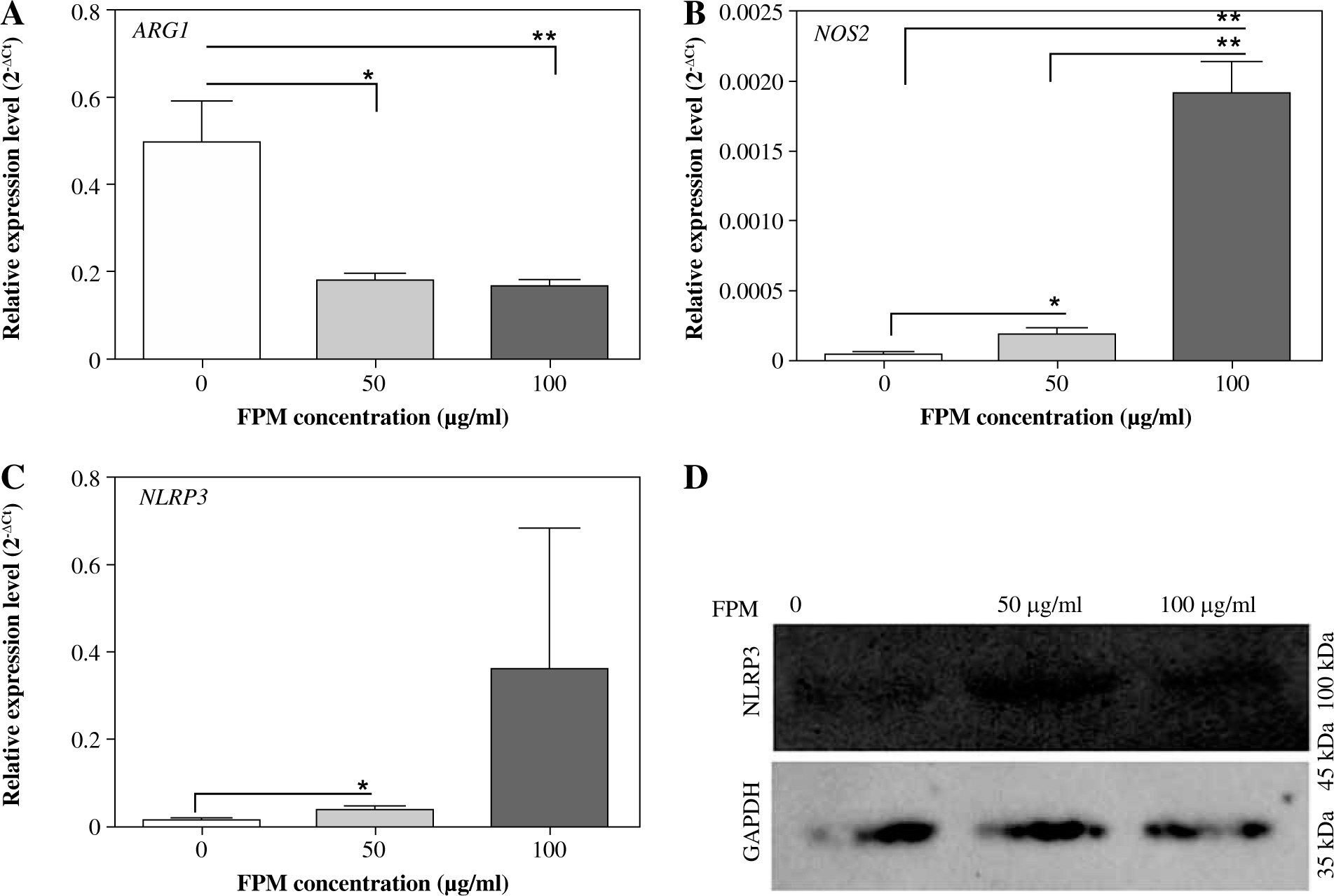 Detection of M1-phenotype marker and M2-phenotype marker expression in peritoneal macrophages after acute fine particulate matter (FPM) stimulation in vitro. A-C) Measurement of the relative expression of ARG1, NOS2, and NLRP3 with qRT-PCR. D) Western blotting analysis of NLRP3. GAPDH was used as an internal reference