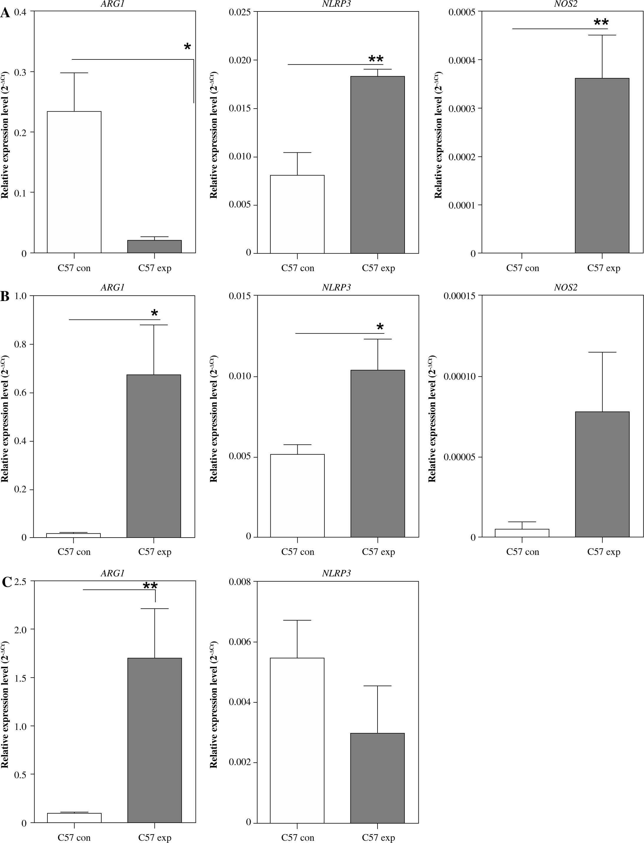 To further study the effect of FPM on macrophage polarization, we conducted in vivo FPM challenge. Six- to eight-week-old mice were randomly divided into two groups: the control group and the exposure group. Mice were sacrificed, and peritoneal macrophages were isolated after exposure of different duration. The expression of NLRP3, NOS2, and ARG1 in peritoneal macrophages was detected by qRT-PCR. The results showed that the expression of NLRP3, NOS2, and ARG1 changed with the FPM exposure time. The expression levels of NLRP3 and NOS2 were significantly increased. The expression of ARG1 was significantly decreased after 7 days of exposure to concentrated ambient FPM (Fig. 4A). NLRP3, NOS2, and ARG1 were up-regulated after 14 days of FPM exposure (Fig. 4B). The expression of NLRP3 decreased. The expression of ARG1 increased significantly after 3 months of FPM exposure (Fig. 4C). The expression of NOS2 was not detected after 3 months of FPM exposure. These results implied that FPM exposure time affects peritoneal macrophage polarization.