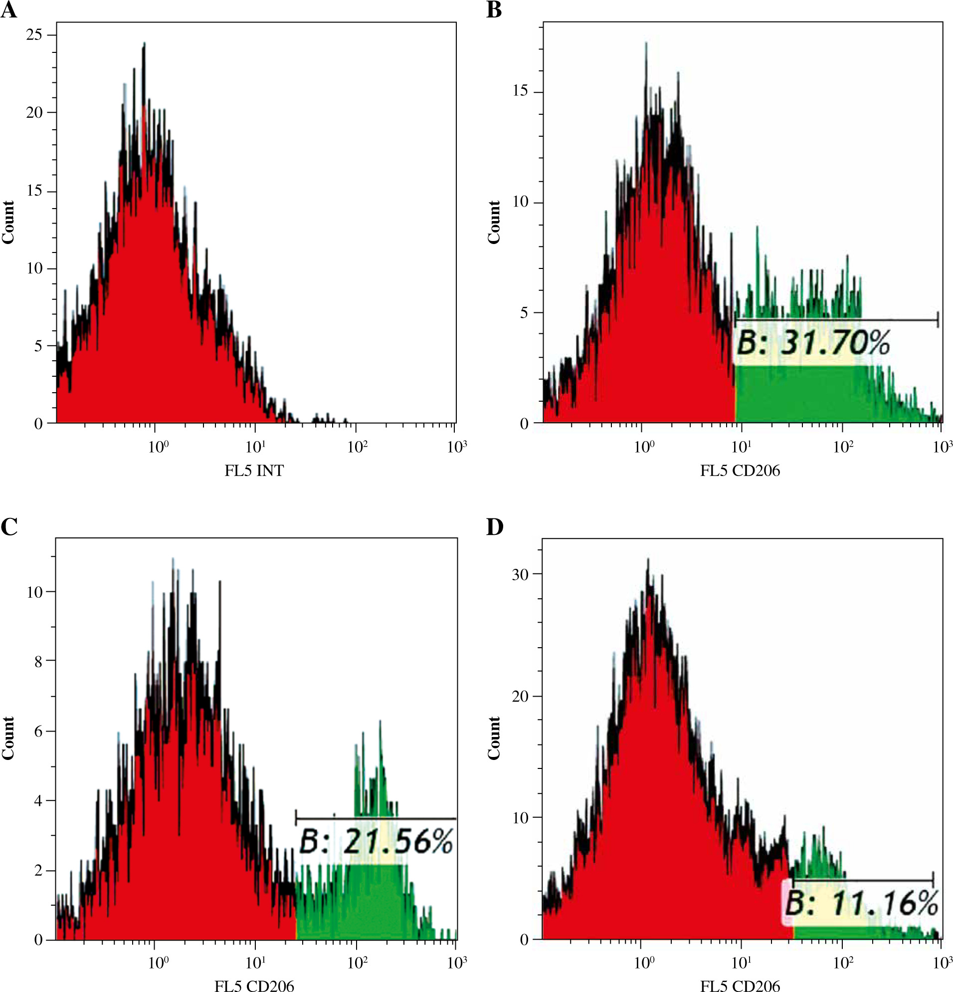 The culture medium was discarded, and the cells were washed with phosphate buffered saline (PBS) (Hyclone, USA) three times. The cells were harvested and washed twice with the washing liquid (PBS containing 1% bovine serum albumin [BSA]). The cells were re-suspended with the washing liquid and divided into two tubes. The PE/Cy7 anti-mouse CD206 antibody (BioLegend, USA) and Rat IgG (ZSGB-Bio, China) were added, respectively. The mixtures were incubated at 4oC for 30 minutes. The reaction tube was mixed upside down every 10 minutes during incubation. The mixtures were centrifuged at 1000 rpm for 5 minutes, and the supernatant was discarded. The cells were washed with PBS three times and re-suspended with 4% paraformaldehyde. The cells were detected with flow cytometry (BD, USA).