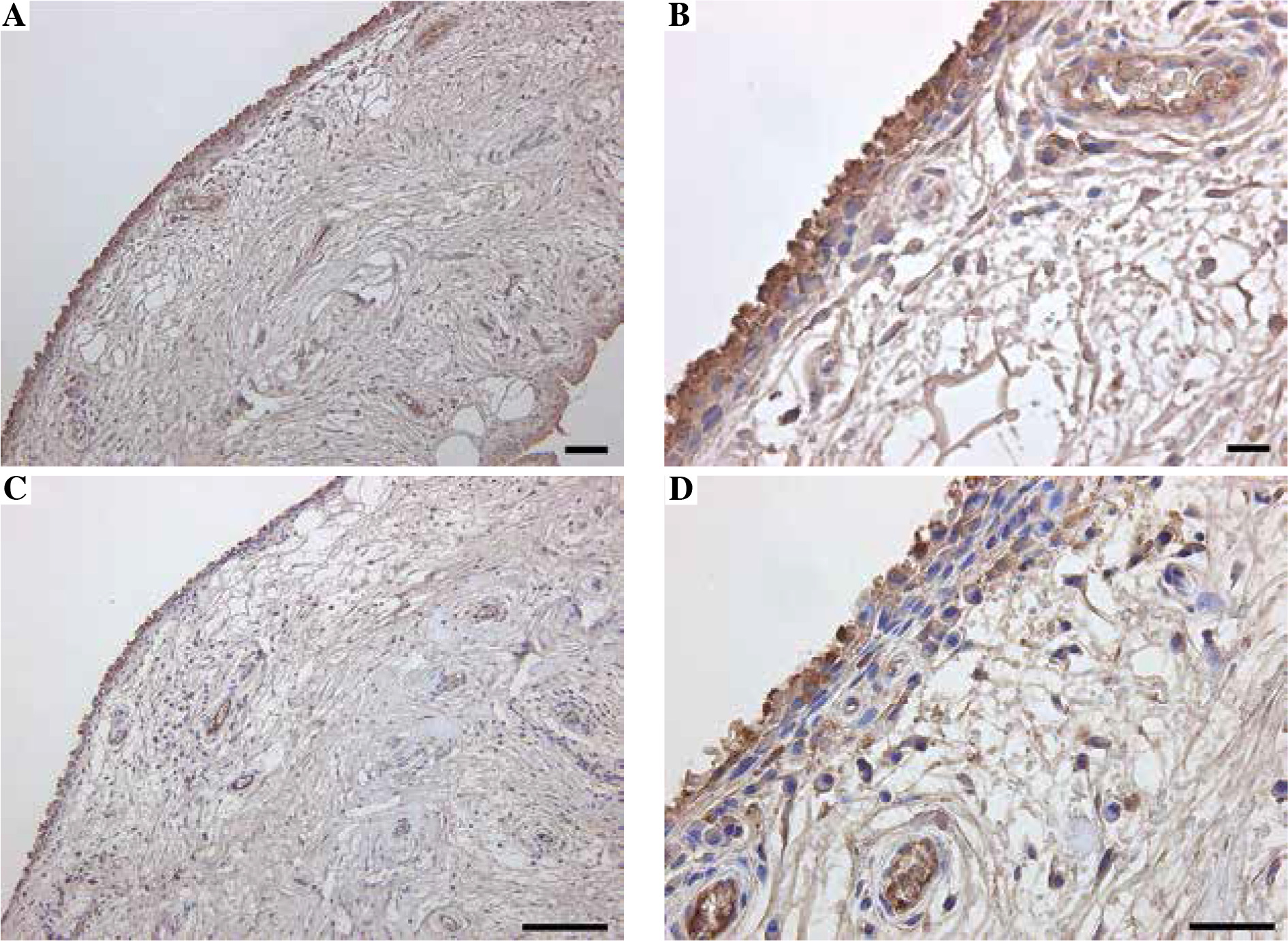 Immunolocalization of Mincle and TNF-α in synovial tissue. Immunolocalization of Mincle (A, B) and TNF-α (C, D). Scale bars = 100 μm