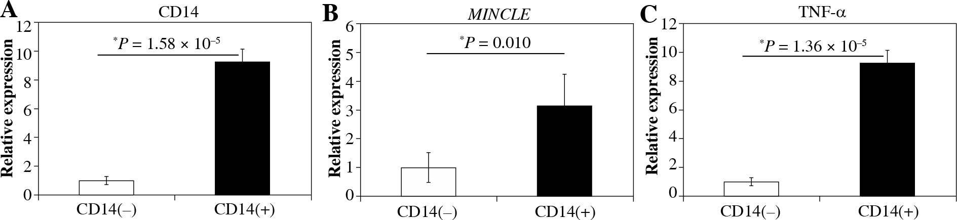 Quantitative polymerase chain reaction (qPCR) analysis of CD14, MincLE, and TNF-α mRNA levels in CD14-negative and -positive synovial cells extracted from knee osteoarthritis patients. A) CD14, B) MincLE, C) tnFa. Data indicate mean ±standard error (SE) (n = 8). *Statistical difference between CD14-negative- and -positive cells