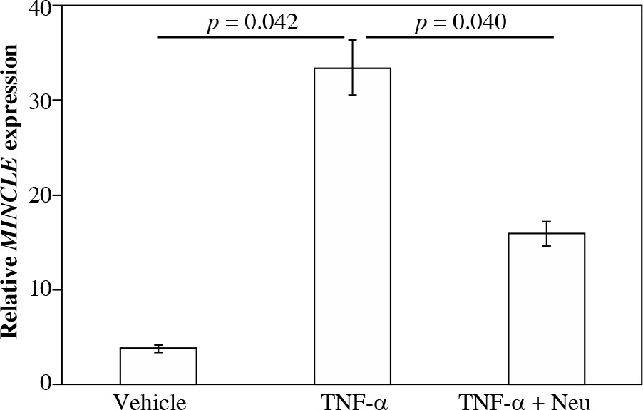 Stimulation of cultured CD14+ fractions with exogenous TNF-α significantly raised MINCLE mRNA expression compared to vehicle-stimulated controls (8.9-fold, p = 0.042). In contrast, stimulation with TNF-α neutraliz-ing antibody significantly reduced MINCLE mRNA expression compared to exogenous TNF-α-stimulated cells (p = 0.040).