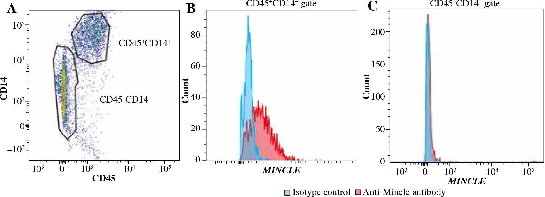 Flow cytometric analysis of MincLE expression in CD14-negative and -positive synovial cells extracted from knee osteoarthritis patients. A) Dot-plot analysis of CD45+CD14+ cells and CD45–CD14– cells. X-axis, CD45; y-axis, CD14. B, C) Histogram analysis of MincLE expression in the CD45+CD14+ (B) and CD45–CD14– (C) gated regions in (A)