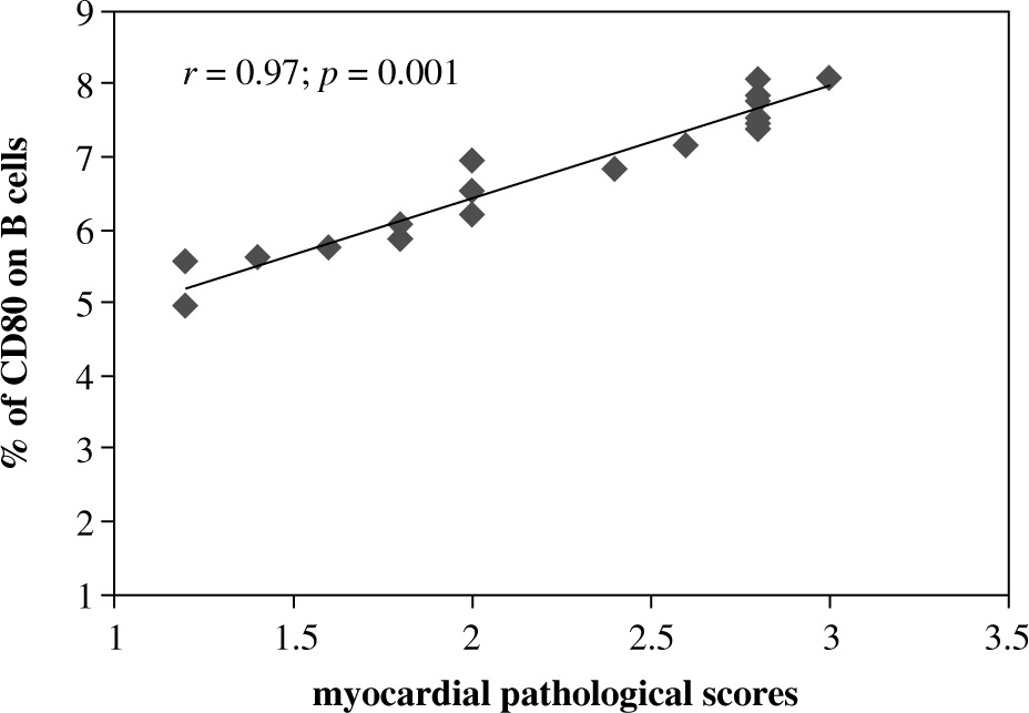To determine whether CD80+/CD86+B cells are associated with the severity of inflammation in VMC, flow cytometry results were related to heart tissue pathology scores. The frequency of CD80+ B cells was positively related to the severity of VMC heart pathology scores (p < 0.01) (Fig. 3), while the frequency of CD86+ B cells was not (data are not shown).