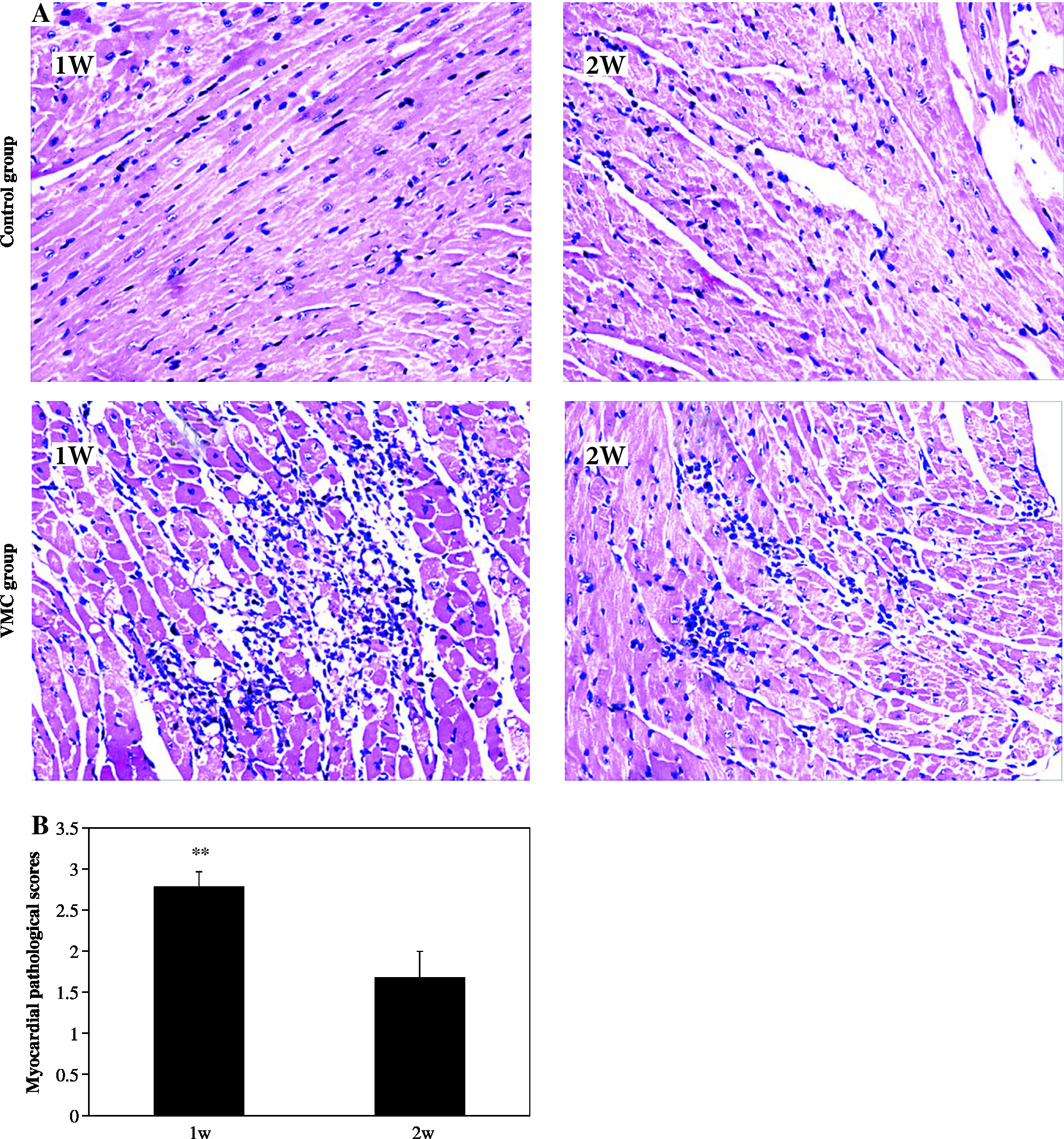 There were nine survivors in the 1w VMC subgroup and in the 2w VMC subgroup, respectively. No deaths were observed in the control group. For the 1w VMC subgroup there was extensive heart inflammatory cell infiltration and necrosis. By contrast, there was little less inflammatory cell infiltration and necrosis in the hearts of the 2w VMC subgroup. No inflammatory cell infiltration or necrosis was observed in the hearts of the control group (Fig. 1A). The myocardial pathology scores for the VMC groups are summarised in Figure 1B.