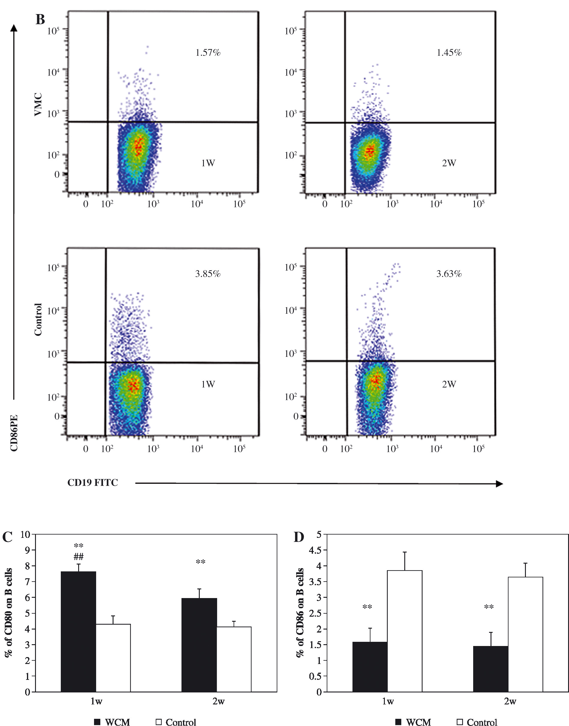 CD80+B cells, not CD86+B cells, were increased in VMC. A) Representative pictures from VMC and control mice for the frequency of CD80+ B cells, B) representative pictures from VMC and control mice for the frequencies of CD86+ B cells, C) the results of CD80+ B cell statistical analysis, D) the results of CD86+ cell statistical analysis. ** p < 0.01 vs. control group (n = 8). ## p < 0.01 vs. 2w VMC subgroup (n = 9). Data are presented as mean ±SD