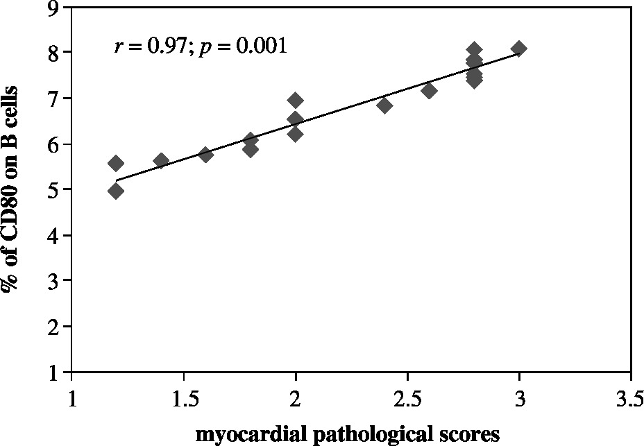 To determine whether CD80+/CD86+B cells are associated with the severity of inflammation in VMC, flow cytometry results were related to heart tissue pathology scores. The frequency of CD80+ B cells was positively related to the severity of VMC heart pathology scores (p < 0.01) (Fig. 3), while the frequency of CD86+ B cells was not (data are not shown).