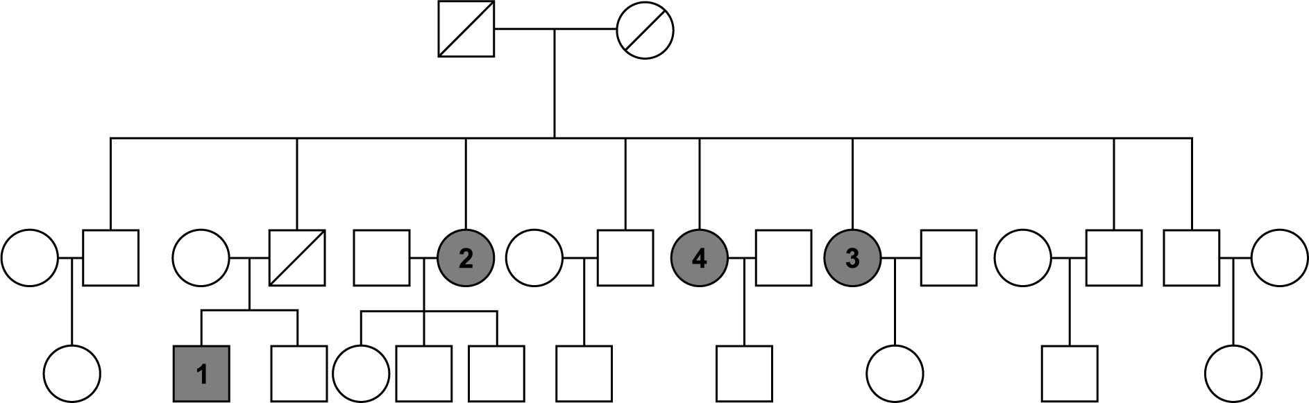 SAPHO syndrome is a rare chronic autoinflammatory disease characterized by synovitis, acne, pustulosis, bone hypertrophy, and osteitis. While familial aggregation suggests a potential genetic basis, the precise underlying genetic mechanisms remain elusive. We identified a unique family cohort comprising four affected individuals, consisting of one male and three females. The pedigree diagram is shown in Figure 1. To our knowledge, this is the first reported instance of male patients within a familial context in the existing literature on SAPHO syndrome.