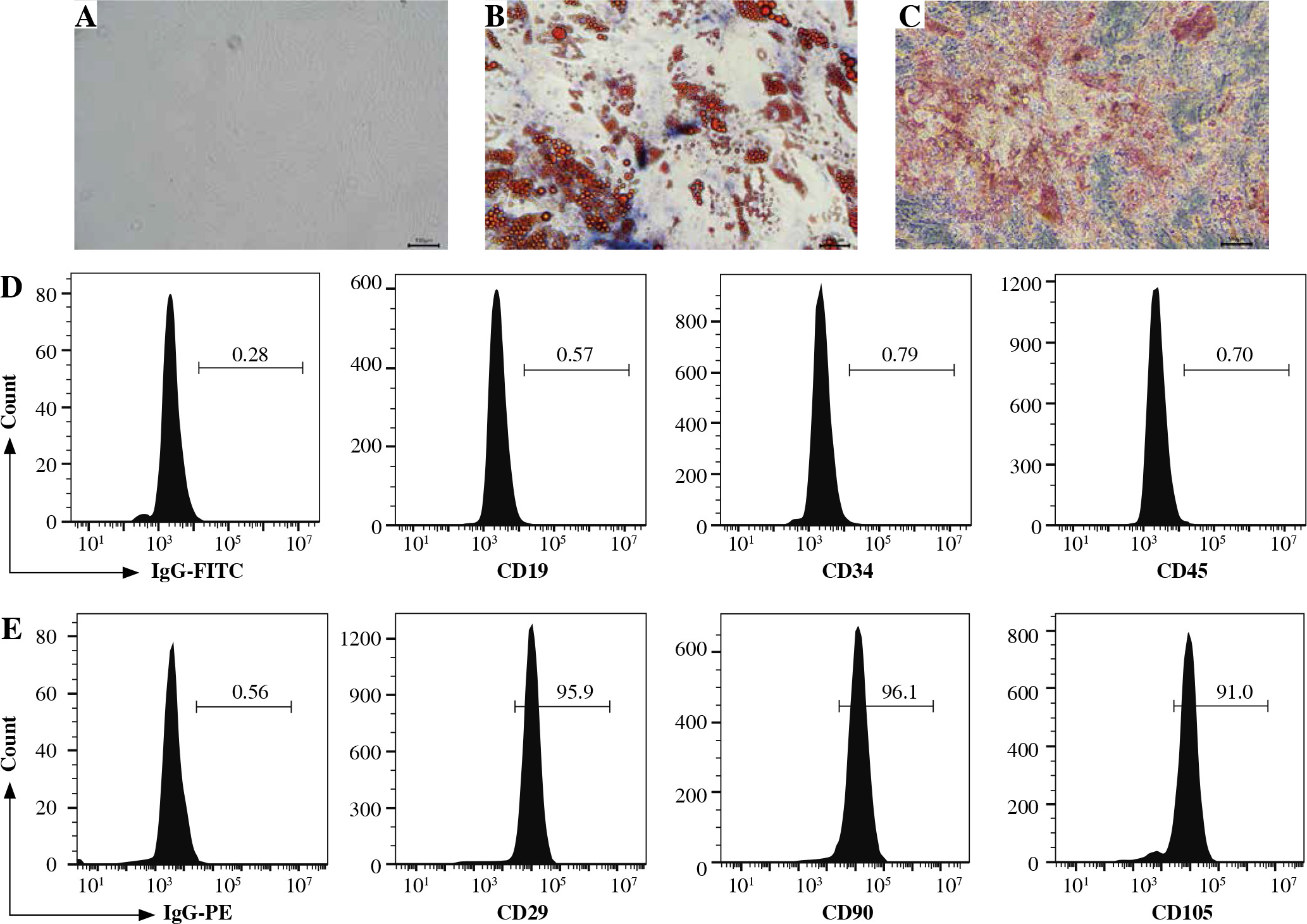 Morphological and phenotypic characteristics of GCMSCs. A) Representative morphological image of GCMSCs at the third passage (40×). B) Adipogenic dierentiation (Oil red O, 200×). C) Alkaline phosphatase staining detection for osteogenic differentiation (200×). D, E) Flow cytometric analysis of the surface markers (CD19, CD29, CD34, CD45, CD90, and CD105) on GCMSCs