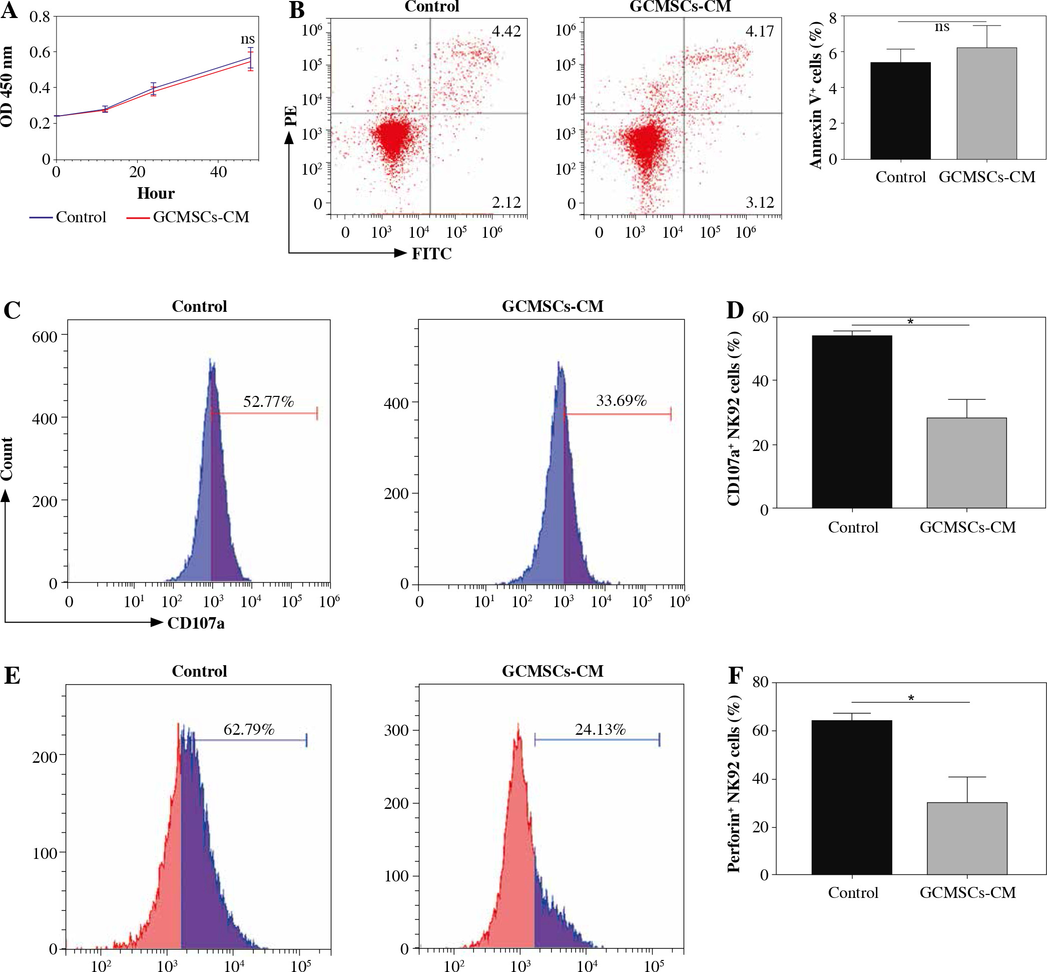 GCMSCs-CM suppressed NK cell degranulation, perforin production and cytotoxicity. A) Proliferation of NK92 cells treated with GCMSCs-CM was detected by CCK-8 assays. B) After co-culture with control CM, GCMSCs-CM for 48 h, NK92 cells were collected and stained with annexin V/PI (n = 3). NK92 cells treated with control CM and GCMSCs-CM for 48 h were analysed through ow cytometry for CD107a (C) and perforin (E). Quantication of the per- centages of CD107a positive (D) and perforin positive (F) cells are shown. Data are shown as mean ± SEM. A paired t test was used for comparisons. *p < 0.05, ns, p > 0.05