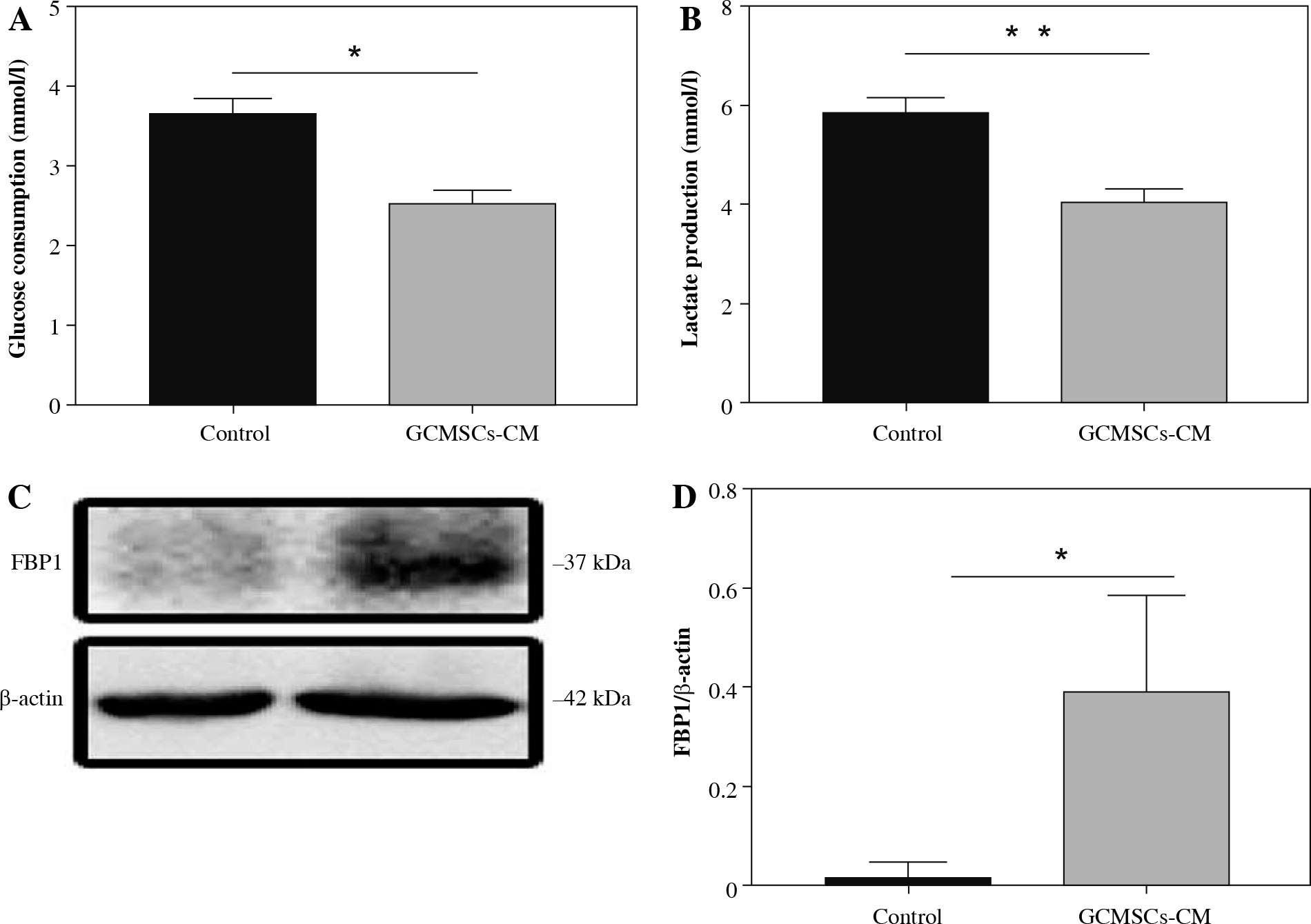 GCMSCs-CM decrease glucose metabolism and promote FBP1 expression of NK92 cells. A) Glucose uptake in NK92 cells treated with the GCMSCs-CM or control medium. B) Lactate production in NK92 cells treated with the GCMSCs-CM or control medium. C) Immunoblotting of FBP1 expression in NK92 cells treated with control medium or GCMSCs-CM for 48 h. D) Quantitative statistics of FBP1 expressed in different groups. Data are shown as mean ± SEM