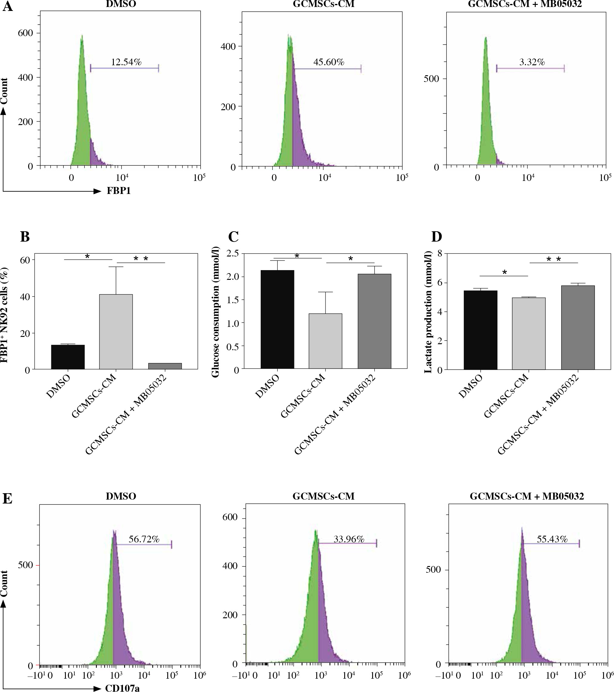 Given the observation that NK92 cells showed a higher level of FBP1 expression and lower level of glucose metabolism when treated by GCMSCs-CM, we supposed that NK cell function could be mediated by FBP1 through glycolysis inhibition. Firstly, MB05032, an inhibitor of FBP1 which was verified as effective through flow cytometry (Fig. 5A, B), or DMSO (control) was added with GCMSCs-CM. As expected, GCMSCs-CM added with inhibitor did not affect the NK cell glucose consumption capacity (Fig. 5C) or lactate production level (Fig. 5D), showing that FBP1 inhibited glycolysis in NK cells directly. Then, the effect of FBP1 on the effector function was explored. It was found that FBP1 inhibition increased the NK92 cell degranulation capacity (Fig. 5E, F) and perforin production (Fig. 5G, H) compared with the GCMSCs-CM group. In addition, NK92 cell cytotoxicity was restored when FBP1 inhibitor was added (Fig. 5I). Furthermore, these results suggest that FBP1 plays an important role in NK cell functional fate.