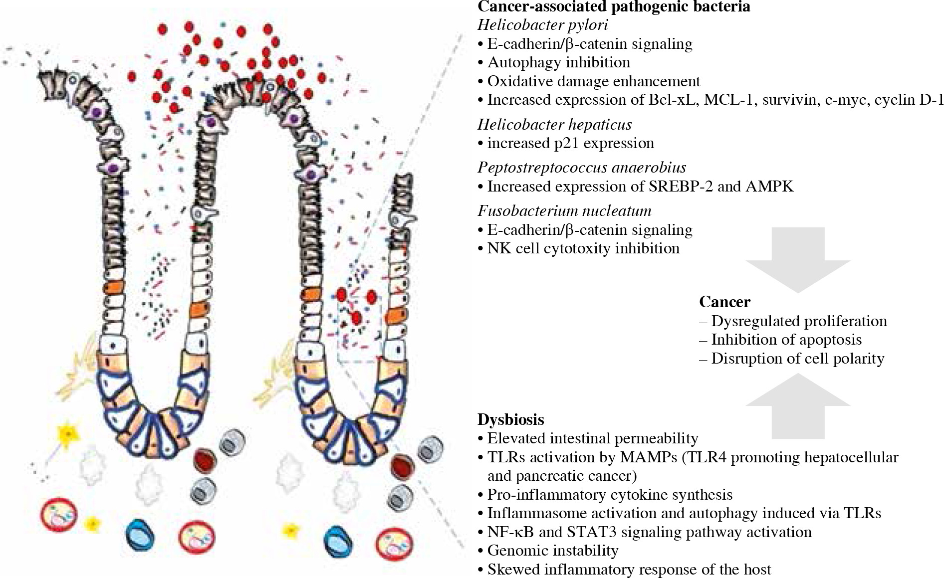 Currently, CRC is the third most common cancer worldwide. It was reported that the abundance of Enterococcus faecalis, Fusobacterium nucleatum, Streptococcus bovis/gallolyticus, Escherichia coli, Peptostreptococcus anaerobius, Bacteroides fragilis and Helicobacter hepaticus has an impact on colorectal carcinogenesis [20, 29-32]. Patients with CRC were shown to have higher counts of Enterococcus faecalis in comparison to healthy subjects [33]. Fusobacterium nucleatum was demonstrated to modulate the E-cadherin signaling pathway, cause the activation of T-cell factor, b-catenin, NF-kB, c-myc and cyclin D1. These may enhance proliferation of colon cancer cells [34]. In Streptococcus bovis-infected tissues, higher expression levels of pro-inflammatory mediators, such as IL-1β, IL-8 and COX-2, were found [35]. Helicobacter hepaticus causes the secretion of pro-inflammatory mediators, such as IL-1β, IL-6, IL-8, TNF-α, IFN-γ, so it also contributes to the development of inflammation-induced cancer. Due to the fact that Escherichia coli persists in immune cells and controls secretion of pro-tumoral mediators, it also has an impact on CRC progression [36]. Peptostreptococcus anae-robius abundance was found to be associated with the incidence of CRC in the mechanism encompassing interaction with TLR2 and TLR3, activation of SREBP-2 and AMPK signaling and inducing oxidative stress [29]. Bacteroides fragilis endotoxin was reported to elevate IL-11 production in colon cancer patients, whilst another toxin, fragilysin, was shown to play a role in E-cadherin cleavage, inducing the Th-17 response and activation of STAT3 and b-catenin signaling [30, 31]. Cytolethal distending toxin of Helicobacter hepaticus was found to increase the expression of p21 and promote senescence and endoreplication, thus initiating giant polyploid cells in mice [32].