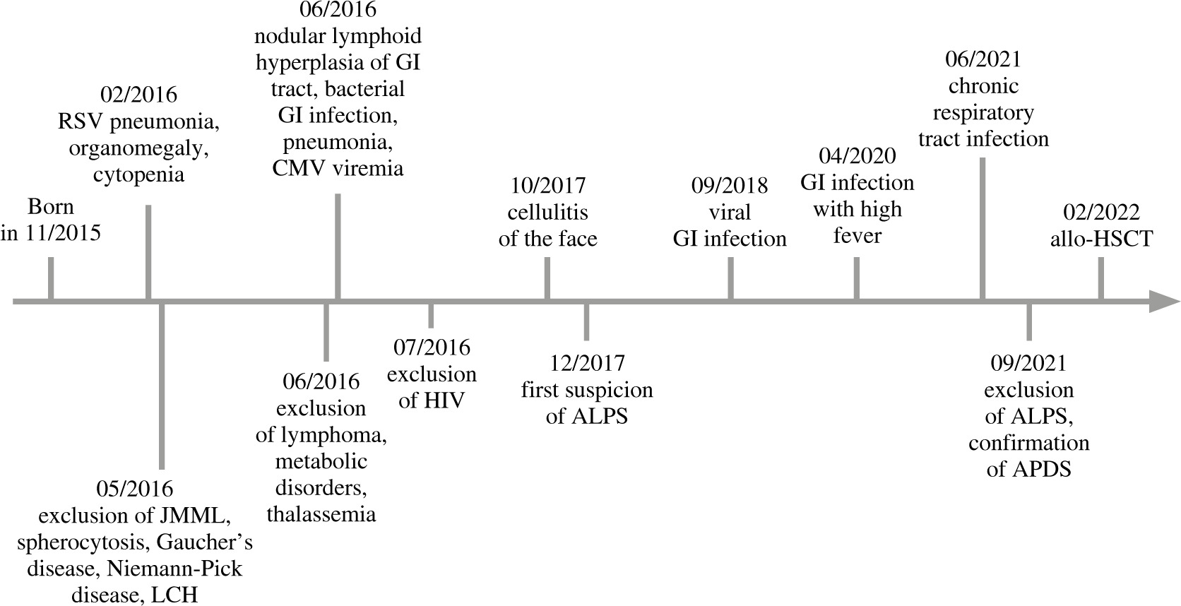 Timeline illustrating major clinical events or findings (above the arrow) and some relevant steps in the diagnostic process (under the arrow). GI – gastrointestinal, JMML – juvenile myelomonocytic leukemia, LCH – Langerhans cell histiocytosis, ALPS – autoimmune lymphoproliferative syndrome, APDS – activated phosphoinositide 3-kinase δ syndrome