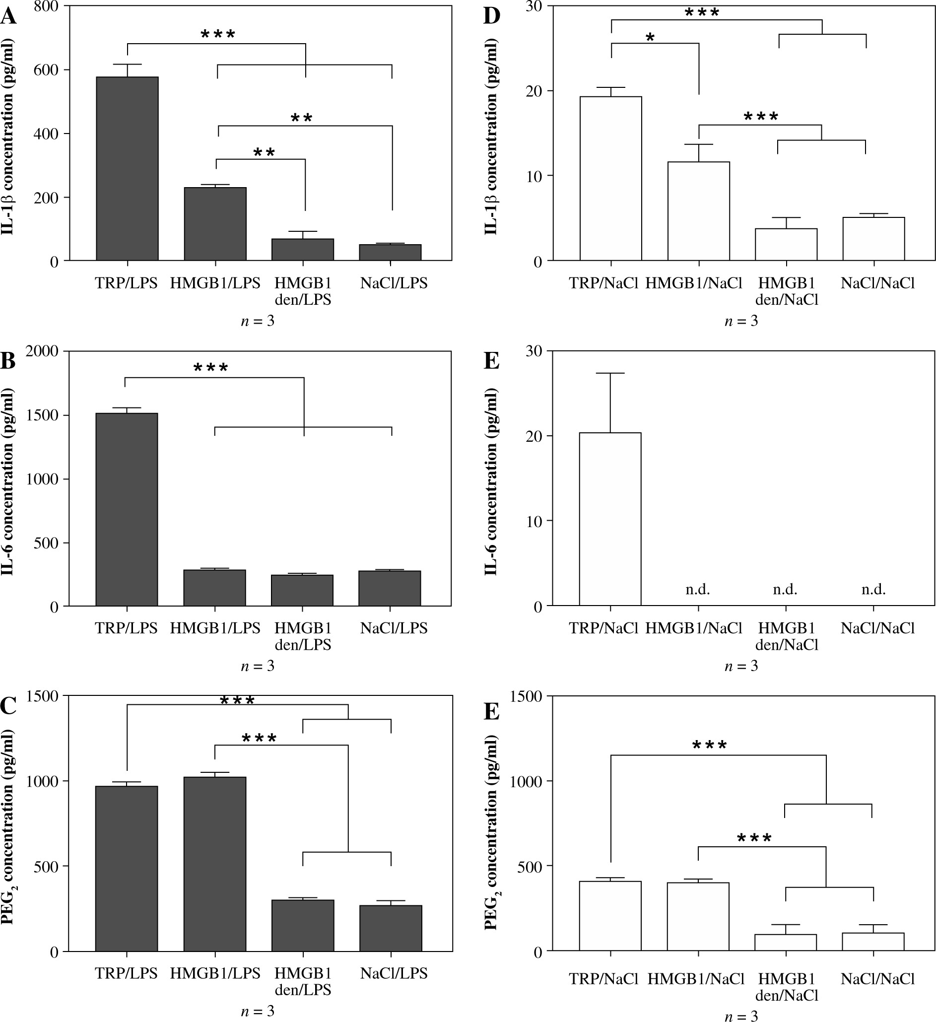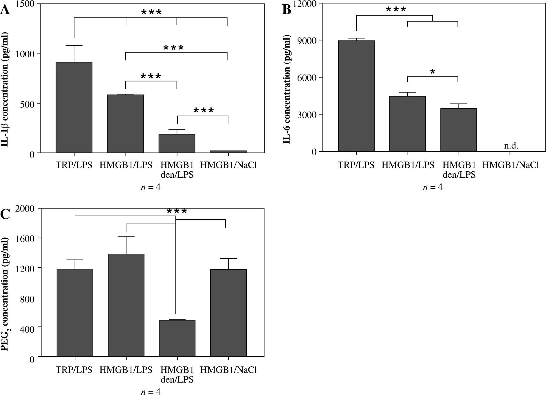 Here, we investigated whether recombinant HMGB1 injected alone sensitizes rats to further contact with LPS. To this end, we measured blood concentrations of IL-1β, IL-6, and PGE2 4 hours after administration of LPS to rats pre-treated with turpentine or recombinant HMGB1 (or heat-denatured recombinant HMGB1 as a control). The concentration of these mediators was also measured in rats pre-injected with HMGB1 and then with saline (as a control for LPS). We found no statistically significant differences in fever mediator concentrations between animals from the HMGB1den/LPS group and animals pre-injected with saline and after 48 hours injected with LPS (data not shown).