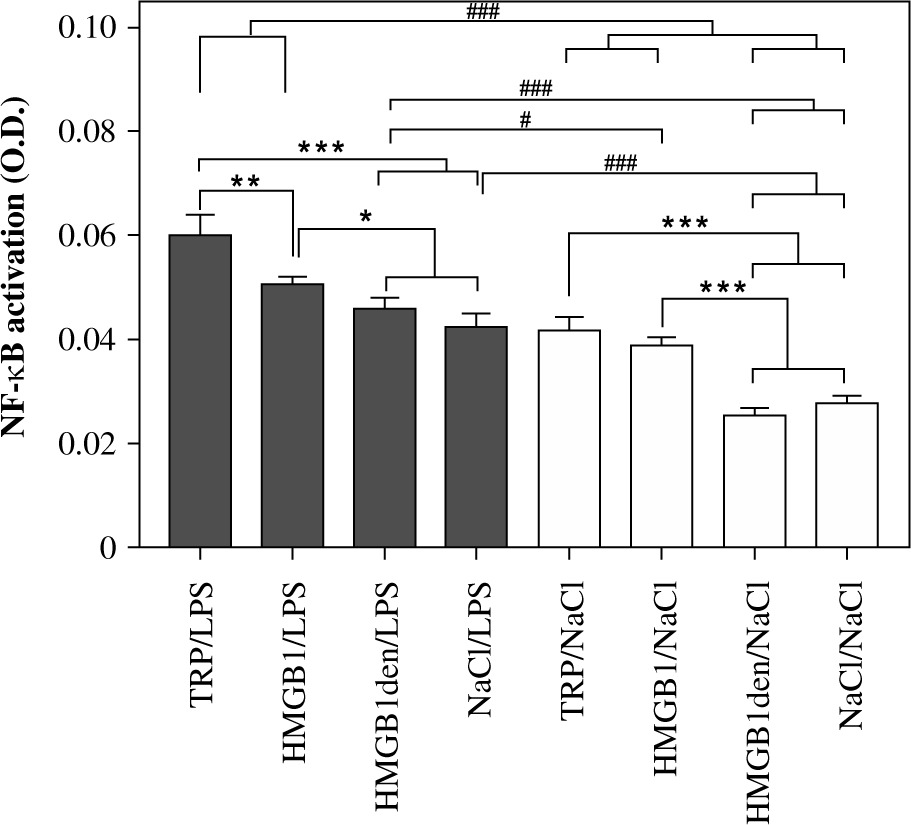 As shown in Figure 4, the highest activation of NF-κB was measured in nuclear extracts of cells isolated from animals injected with turpentine and stimulated with LPS (0.060 ±0.003). Slightly, but statistically significantly (p < 0.05), lower values were measured for the cells isolated from rats injected with HMGB1 (0.050 ±0.001) and the animals treated with HMGB1den (0.046 ±0.001) or NaCl before LPS stimulation (0.043 ±0.002). Activation of NF-κB was comparable in nuclear extracts of cells isolated from rats injected with turpentine (0.042 ±0.002) and HMGB1 (0.039 ±0.001) and incubated with NaCl. However, it was significantly (p < 0.001) higher in both groups in comparison to HMGB1den/NaCl (0.026 ±0.001) and NaCl/NaCl (0.028 ±0.001) experimental groups. Pairwise comparison between cells stimulated with LPS and incubated with NaCl revealed that the activation of NF-κB was significantly (p < 0.001) higher in LPS-stimulated cells isolated from rats injected with TRP or HMGB1 and cells incubated with NaCl from all experimental groups. In contrast, NF-κB activation was significantly (p < 0.001) lower in cells isolated from rats injected with denatured HMGB1 or saline and incubated with NaCl in comparison to all other LPS-stimulated cells. NF-κB activation in cells isolated from rats injected with turpentine or HMGB1 and incubated with NaCl was comparable to LPS-stimulated cells isolated from rats injected with NaCl or denatured HMGB1.