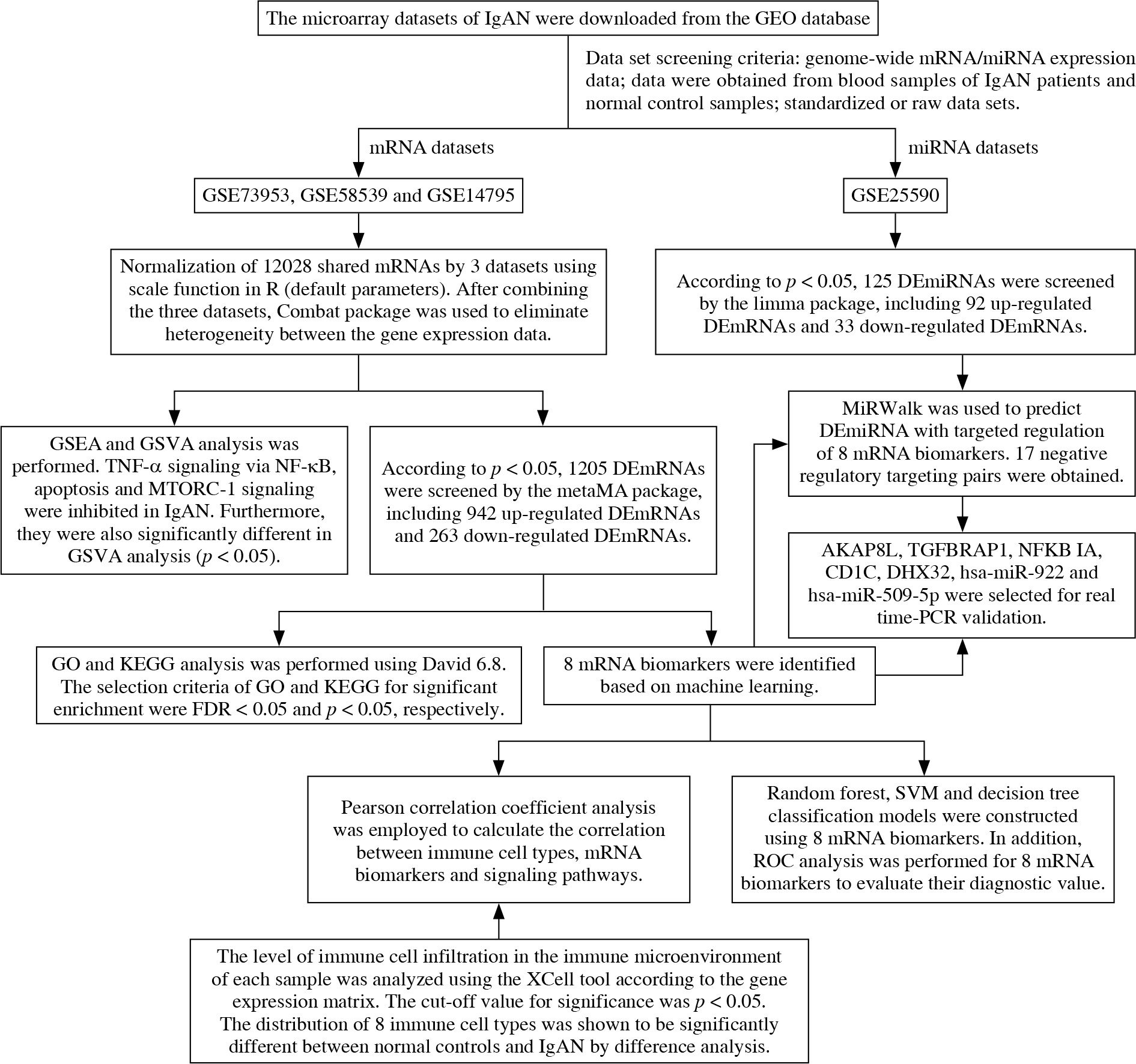 In this study, the data of IgAN were downloaded from the Gene Expression Omnibus (GEO) database. 8 mRNA biomarkers were screened by difference analysis and machine learning. The XCell tool was used to analyze the distribution of immune cells in IgAN and normal controls. Subsequently, correlations between mRNA biomarkers, immune cells and signaling pathways were analyzed. In addition, we analyzed miRNAs and constructed a miRNA- mRNA targeted regulatory network (Fig. 1).