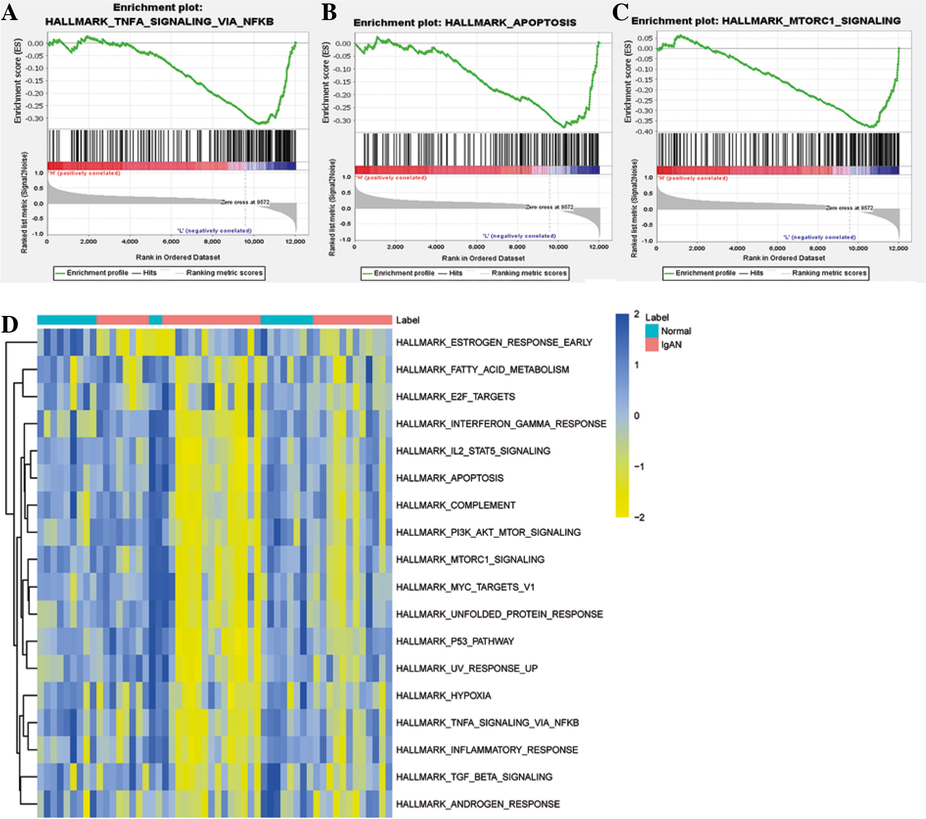 GSEA and GSVA. A) GSEA analysis showed that TNF-α signaling via the NF-κB signaling pathway was inhibited in IgAN; B) GSEA analysis showed that the apoptosis signaling pathway was inhibited in IgAN; C) GSEA analysis showed that the MTORC-1 signaling pathway was inhibited in IgAN; D) GSVA enrichment analysis of IgAN and normal controls