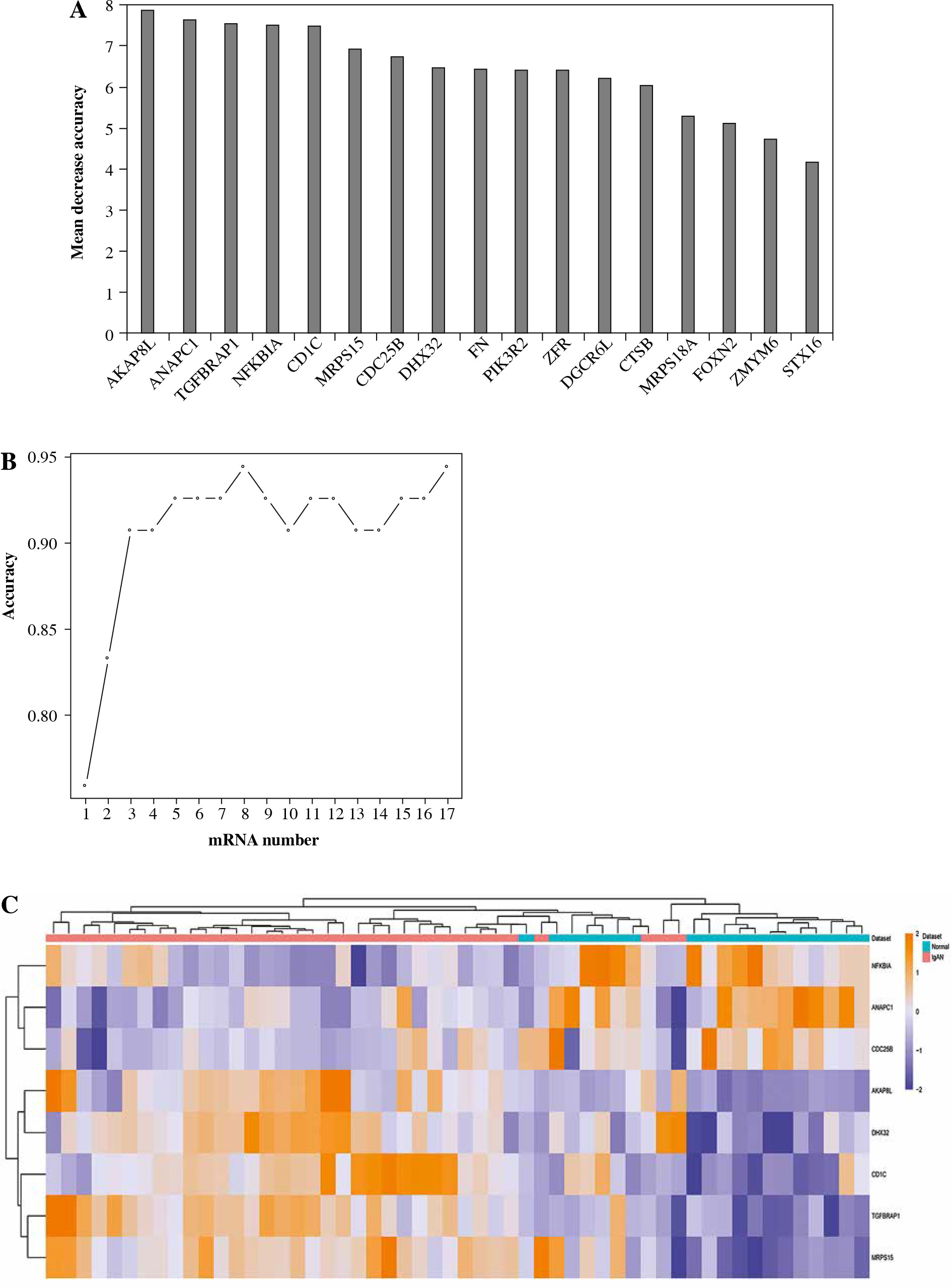 Machine learning to screen important mRNA biomarkers. A) Sort the importance of the 17 mRNAs according to the mean decrease of accuracy value from high to low; B) Trend graph of accuracy rate increasing with the number of mRNA; C) Heat map of 8 mRNA biomarkers. The rows and columns represent genes and samples, respectively. Orange indicates above the reference channel (high expression genes). Purple indicates below the reference channel (low expression genes)