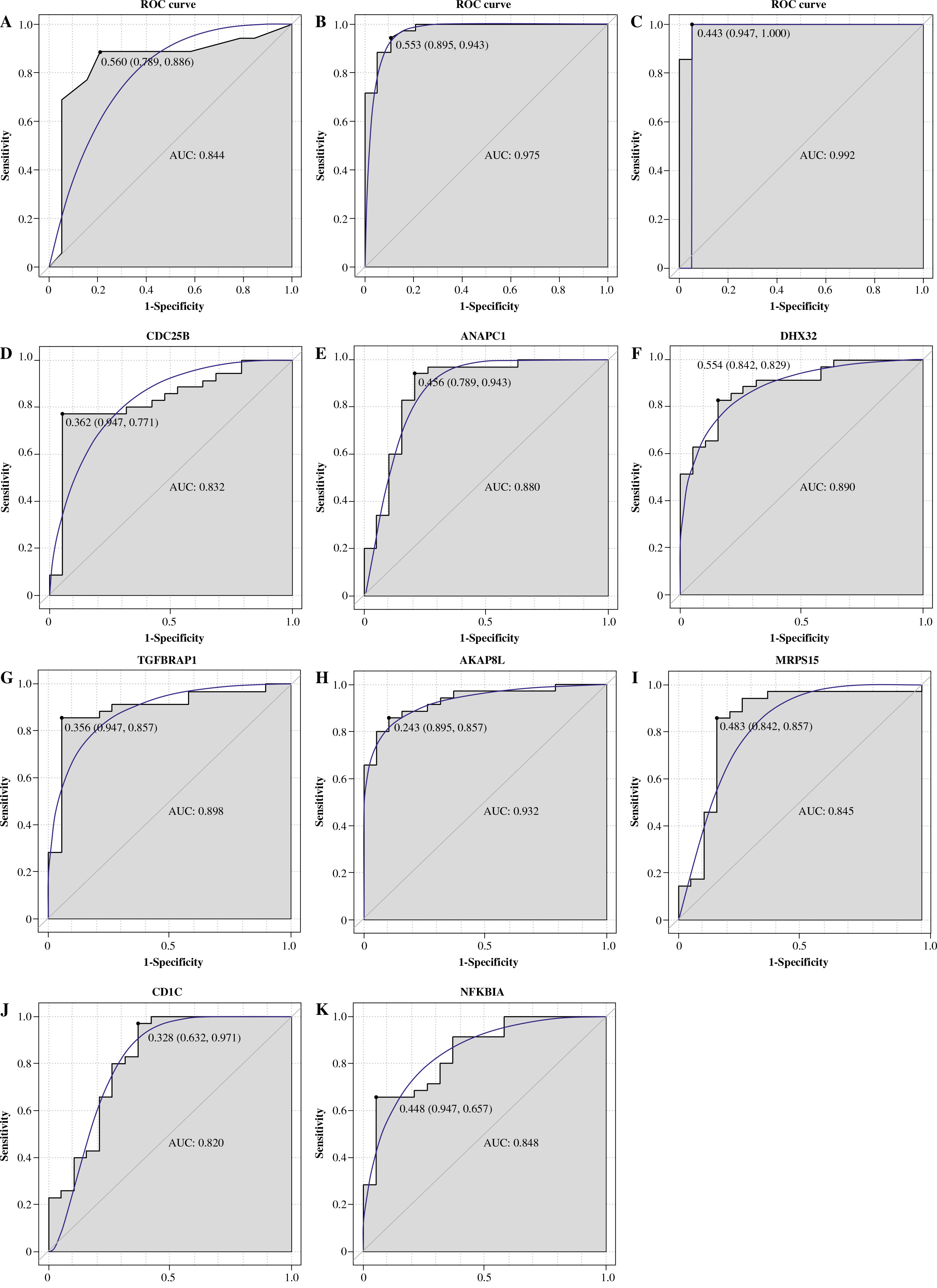 ROC analysis of classification models and genetic biomarkers. A) ROC curve of decision tree classifier; B) ROC curve of random forest classifier; C) ROC curve of support vector machine (SVM) classifier; D-F) ROC curve of 8 mRNA biomarkers (CDC25B, ANAPC1, DHX32, TGFBRAP1, AKAP8L, MRPS15, CD1C and NFKBIA). AUC – area under curve, ROC – receiver operating characteristic G-K) ROC curve of 8 mRNA biomarkers (CDC25B, ANAPC1, DHX32, TGFBRAP1, AKAP8L, MRPS15, CD1C and NFKBIA). AUC – area under curve, ROC – receiver operating characteristic