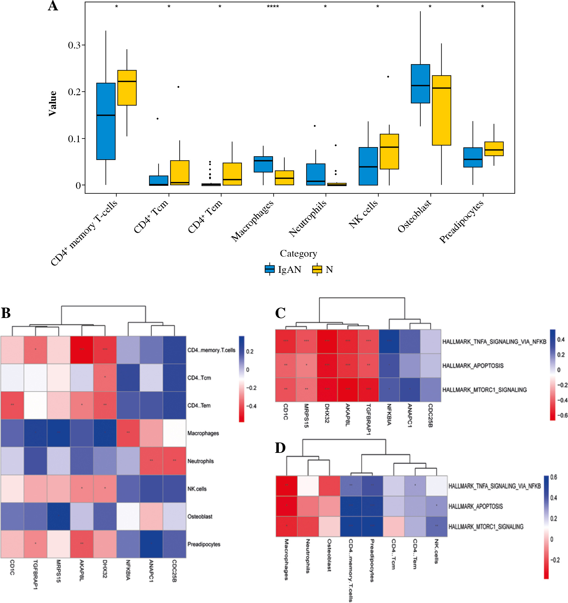Immune correlation analysis. A) The distribution of 8 immune cell types was significantly different between normal controls and IgAN according to difference analysis; B) Pearson correlation coefficient analysis of the correlation between immune cell types and 8 mRNA biomarkers; C) Pearson correlation coefficient analysis of the correlation between 8 mRNA biomarkers and TNF-α signaling via NF-κB, apoptosis, and MTORC-1 signaling; D) Pearson correlation coefficient analysis of the correlation between immune cell types and TNF-α signaling via NF-κB, apoptosis, and MTORC-1 signaling. Blue and red represent positive and negative correlations, respectively. The larger the absolute value of the numerical value, the stronger the correlation. *p < 0.05, **p < 0.01, ***p < 0.001