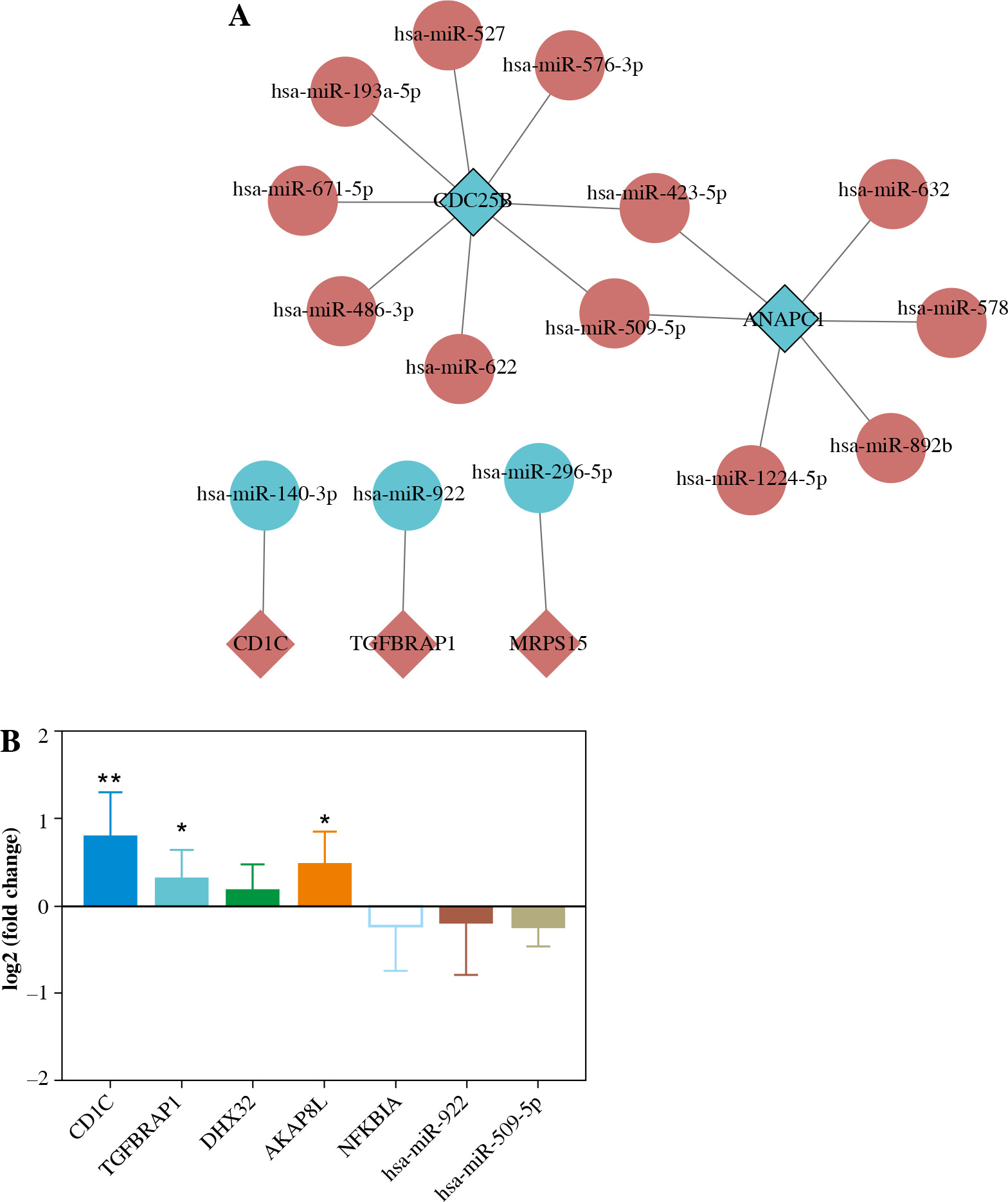 Construction of DEmRNA-DEmiRNA network and real time-PCR validation. A) DEmRNA-DEmiRNA interaction network. Rhombus, circles, blue and red represent mRNA, miRNA, down-regulation, and up-regulation, respectively. Different shapes in bold outside represent the top 10 genes. B) Real-time PCR validation of CD1C, TGFBRAP1, DHX32, AKAP8L, NFKBIA, hsa-miR-922 and hsa-miR-509-5p in blood. According to log 2 fold change > 0 or log 2 fold change < 0, it can be clearly seen whether the gene was up-regulated or down-regulated. *p < 0.05, **p < 0.01